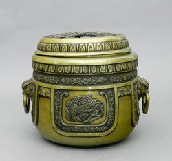Bronzegefäß mit seitlichen Handhaben und durchbrochenem Deckel. Mit der Darstellun...1031-6