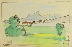 Landschaft mit Häusern, wohl Schweiz. Aquarell. 8 x 12 cm. Links unten...1034-3