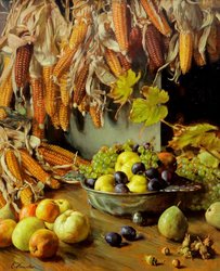 Stillleben mit Mais und herbstlichen Früchten. Öl auf Holzt...1054-2