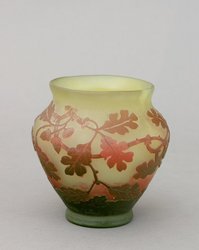 Baluster-Form mit eingezogenem Rand. Milchig gelbes Glas, Rot/ Dunkelgrün...988-1