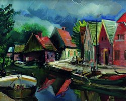 Am Ufer liegende Boote und Häuser. Potsdam. Um 1931. Ã...992-4