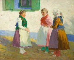Unterhaltung vor dem Haus. Öl auf Malkarton. 20,5 x 24,5 cm. Lin...992-12