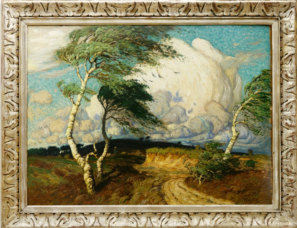 Abb: Hans Hartig, Birken in der Abendsonne (auch: Frühlingssturm in der Lüneburger Heide). Öl auf Leinwand auf Malkarton. 73 x 95,5 cm. Rechts unten signiert sowie rückseitig alt bezeichnet. Gerahmt. -