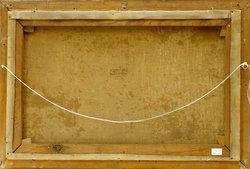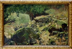 Sonnenbeschienene Gebirgspartie. Um 1885. Öl auf Leinwand. 49,5 x 77,5 cm. Rückseitig auf dem Keilrahmen von alter Hand mit Bleistift betitelt "Felsen am Wald (grün)" sowie mit dem Nachlassstempel des Künstlers versehen. Gerahmt. -Ende der 1880 Jahre beschäftigte sich der Künstler mit den neuen Kunstströmungen. Er wandte sich hin zur Freiluftmalerei und hellte seine Palette auf.  (1001-1)