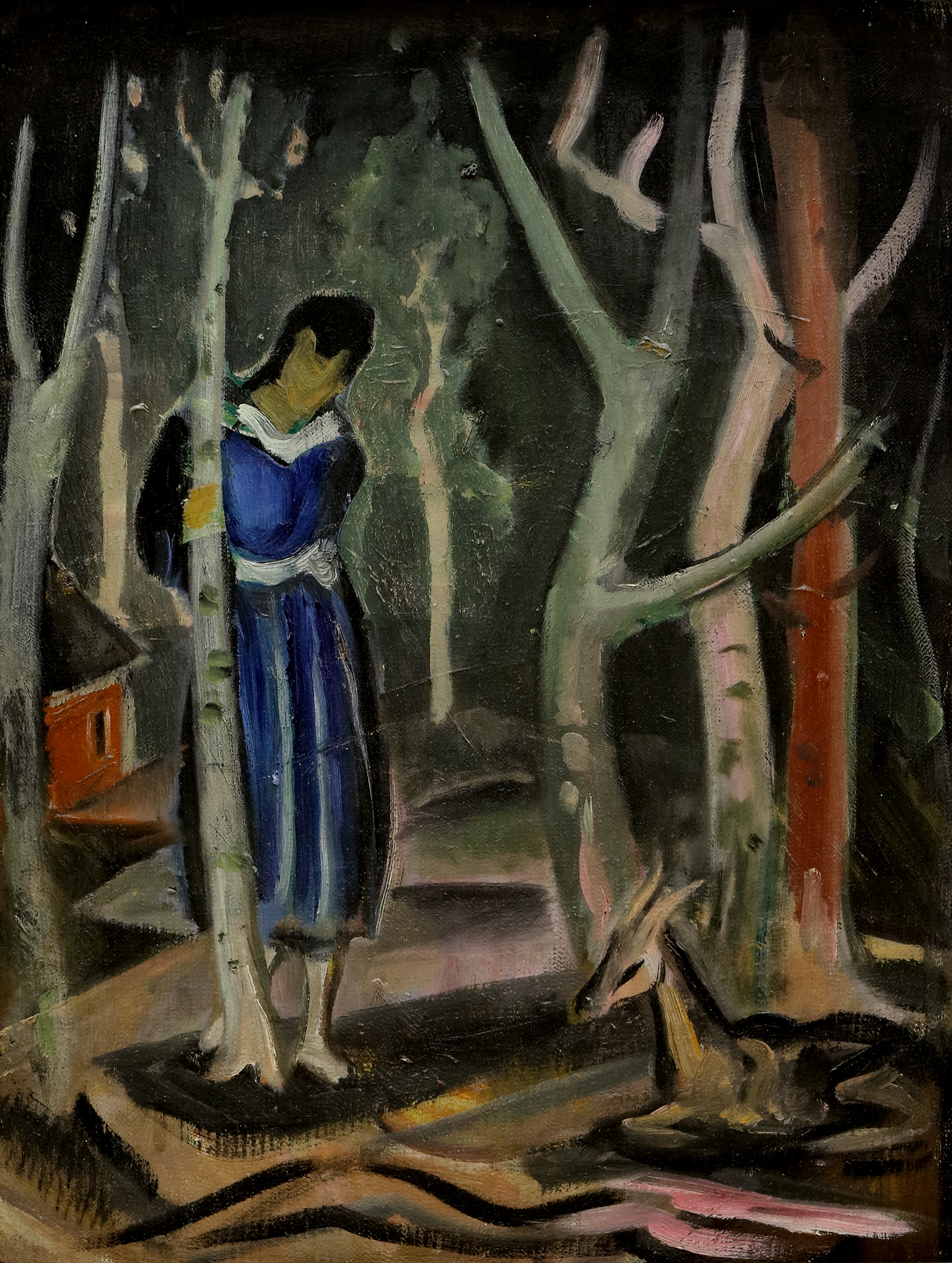 Stehende Frau zwischen Bäumen und ein liegendes Reh. Öl auf Leinwand. 50,5 x 40,7 cm. Rückseitig mit einer Echtheitsbestätigung sowie dem Rundstempel der Kunstakademie Dresden. Gerahmt. -Wallot holte Gussmann 1897 als Lehrer nach Dresden. Dort wurde er später Professor der Ornamentschule an der Königlichen Akademie der Bildenden Künste, schließlich sogar Studiendirektor (Rektor) bis zu seinem Tod. Von 1915 bis 1919 war O. Gussmann Prof. an der Dresdner Kunstakademie (Wikipedia). (1001-3)