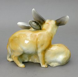 Drei Wüstenfüchse. Entwerfer unbekannt. Glasierte Keramik. H ca. 19 x B 23 x T 17 cm. Im Boden gemarkt Goldscheider Keramik Austria sowie die Nummern 377 und 6. (1007-13)