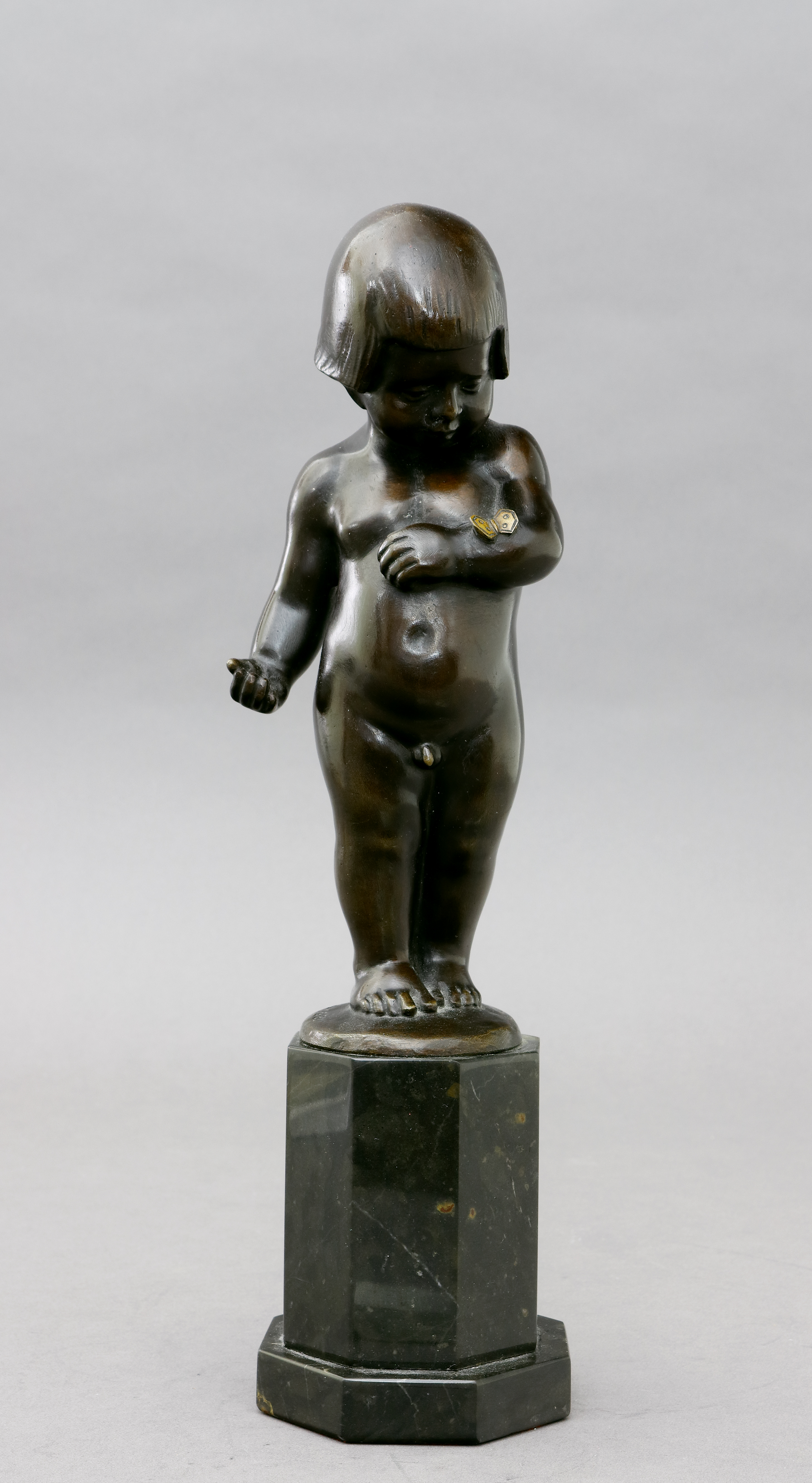 Knabe mit Schmetterling. Bronzefigur mit Plinthe, dort bezeichnet, auf oktogonalem Marmorsockel. H 22,5/23 cm. (1007-17)