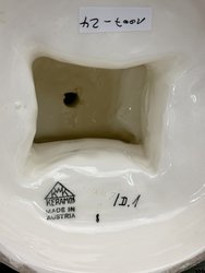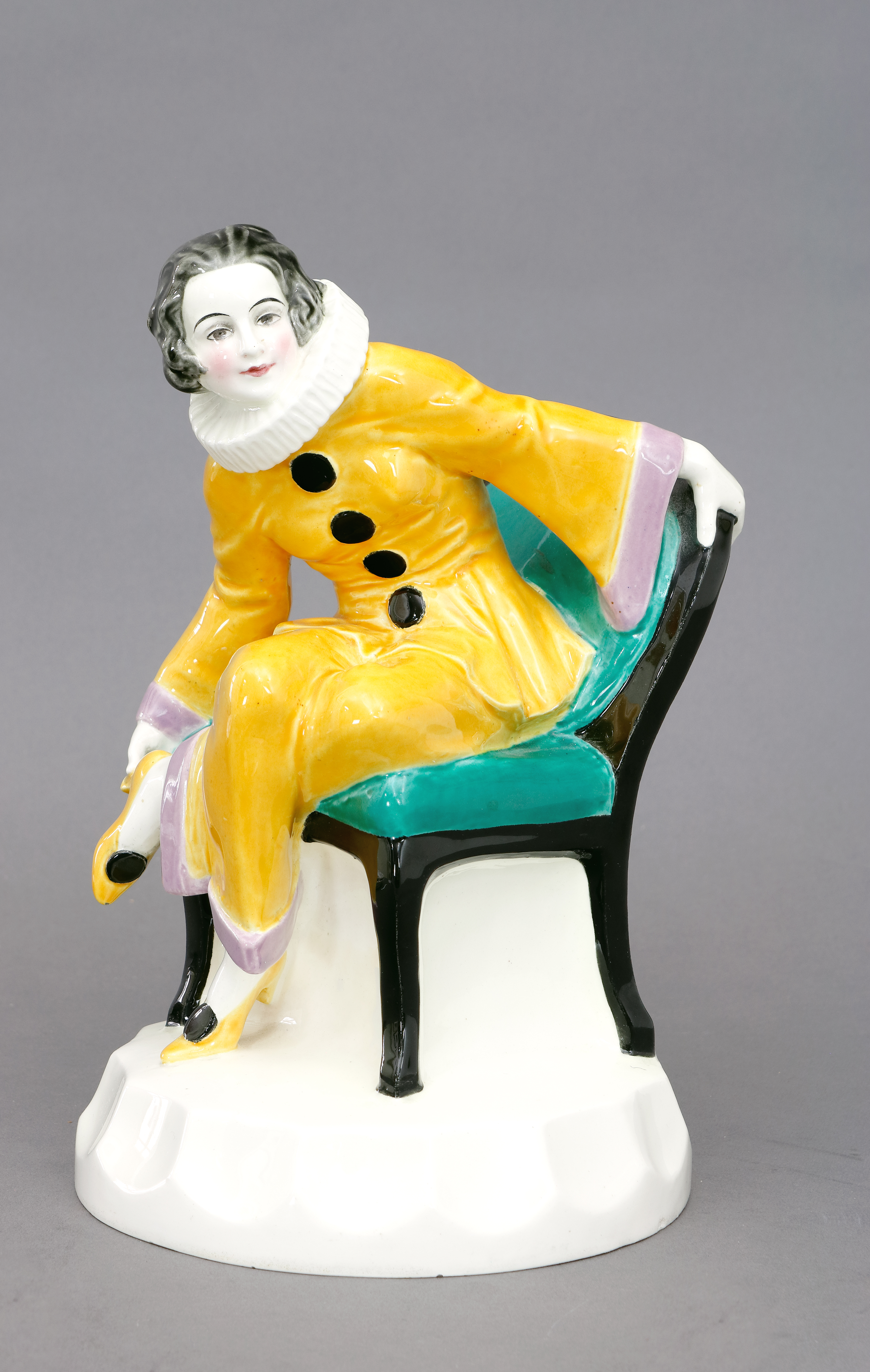 Sitzende Pierrette. Art Deco Figur Keramik. Entwurf Josef Lorenzl (1892 Wien -1950 ebd.). Bunte Unterglasurbemalung. Geprägte Modelln° 447. Stempelmarke Keramos Made in Austria, Wien, um 1919-1949. H 25,5 cm. -Lit.: Matschiner, Keramos, S. 351. (1007-24)