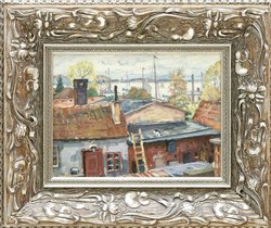 Über den Dächern von Schillersdorf an der Oder. 1921. Öl auf Karton. 26 x 35 cm. Rückseitig Nachlassstempel sowie Echtheitsbestätigung. Gerahmt. (1007-3)