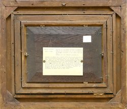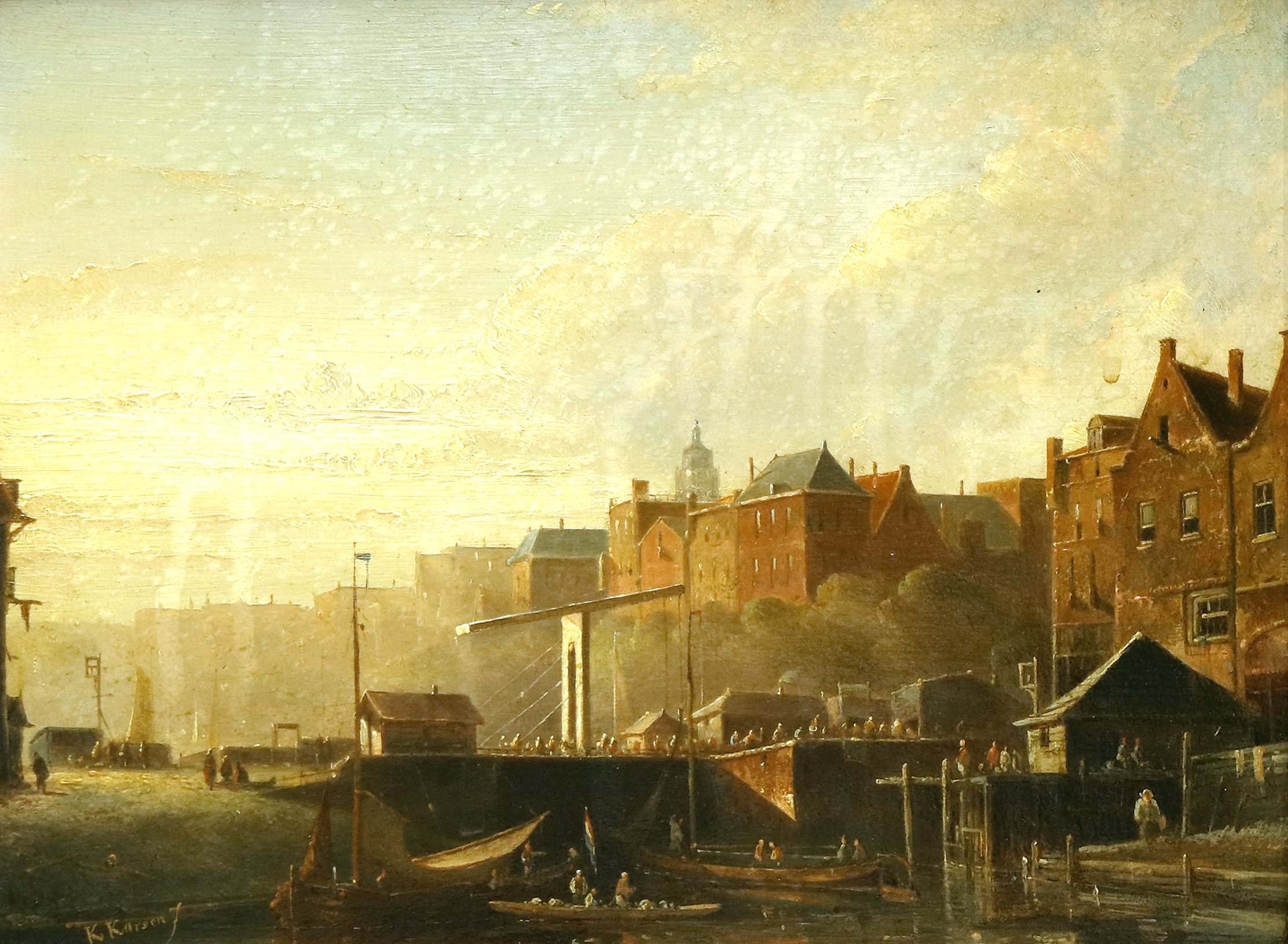 Blick auf das Bickerseiland in Amsterdam. Im Vordergrund die alte Zugbrücke, rechts eine Häuserzeile, die an einem schönen Sonnentag in einen schönen Schatten versinkt. Öl auf Holz. 21 x 28,5 cm. Links unten signiert. Rückseitig auf altem Papierschild bezeichnet. Gerahmt.  (1010-2)