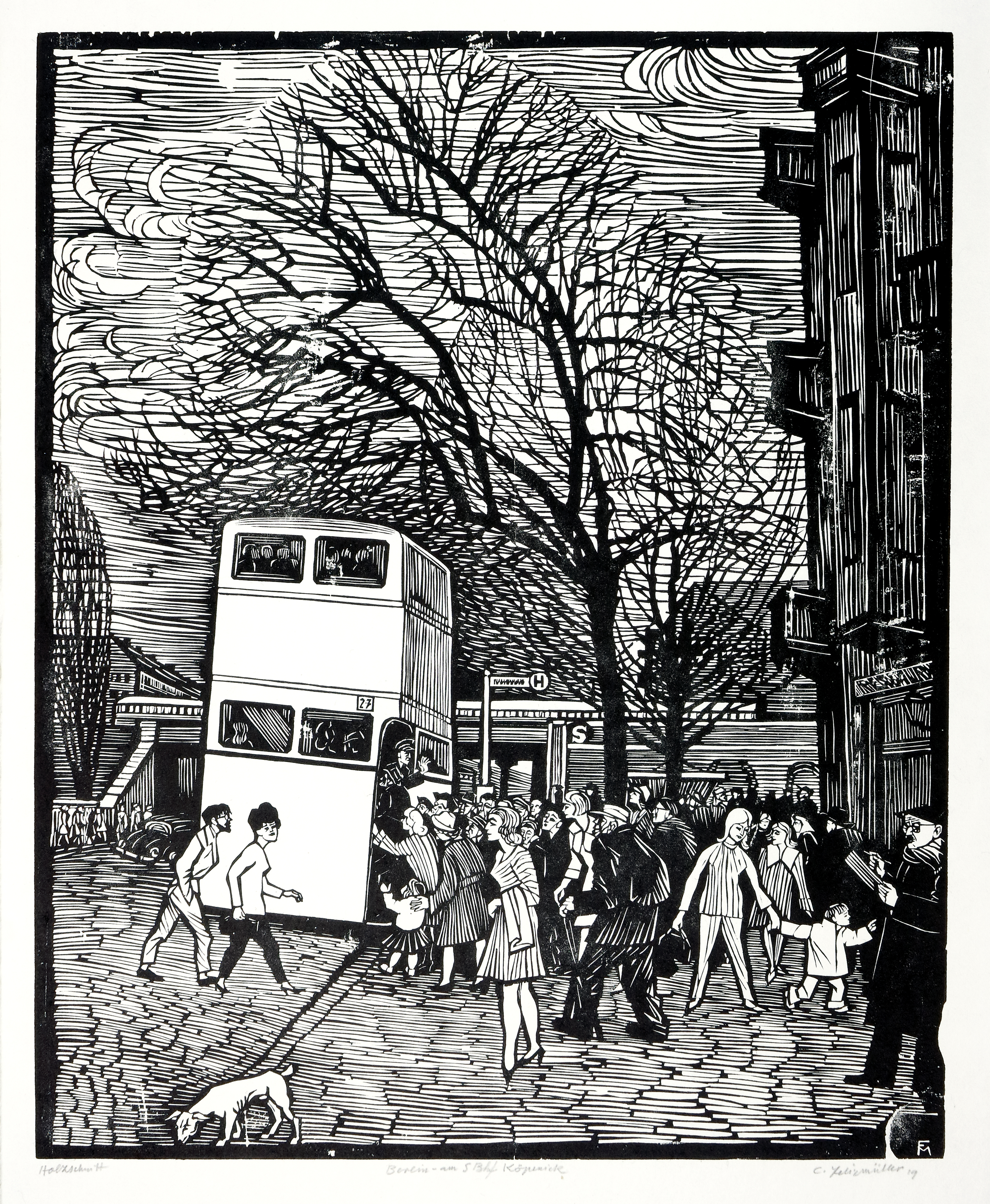 Berlin, Bus-Haltestelle Köpenick. 1963/64. Holzschnitt auf Japanpapier. 49,5 x 39,3 cm, Bg. 59 x 43,7 cm. Signiert und betitelt, in der Platte monogrammiert. -WVZ Söhn 607. -Auflage: einzelne Handdrucke. (1012-1)