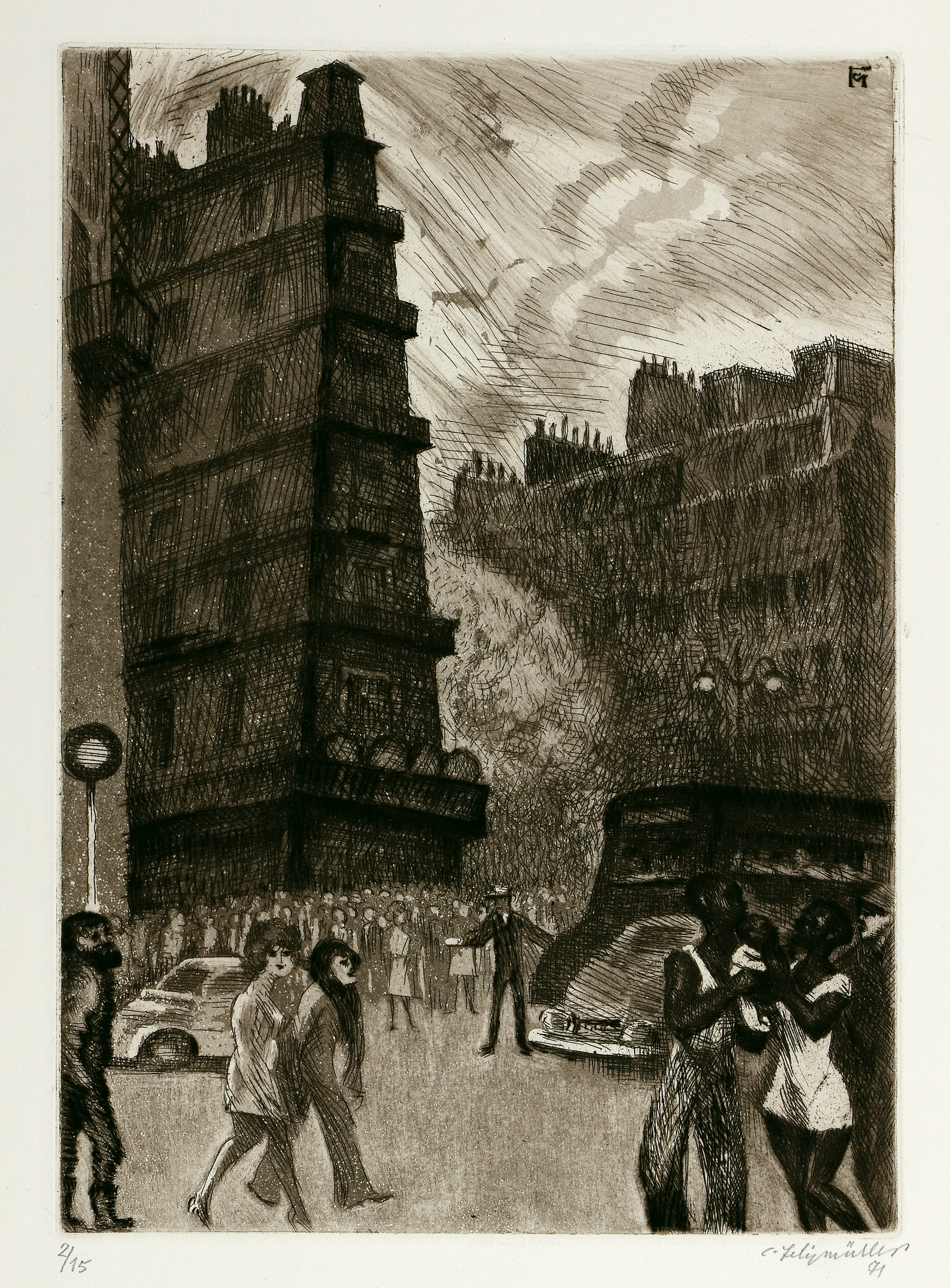 Paris, Rue Lafayette/Ecke Boul. Hausmann. 1971. Radierung (Strichätzung und Aquatinta) in braun auf weißem Büttenpapier. 31,5 x 22 cm, Bg. 45 x 33,5 cm. Signiert, datiert und nummeriert. Exemplar 2/15. -WVZ 660. (1012-6)
