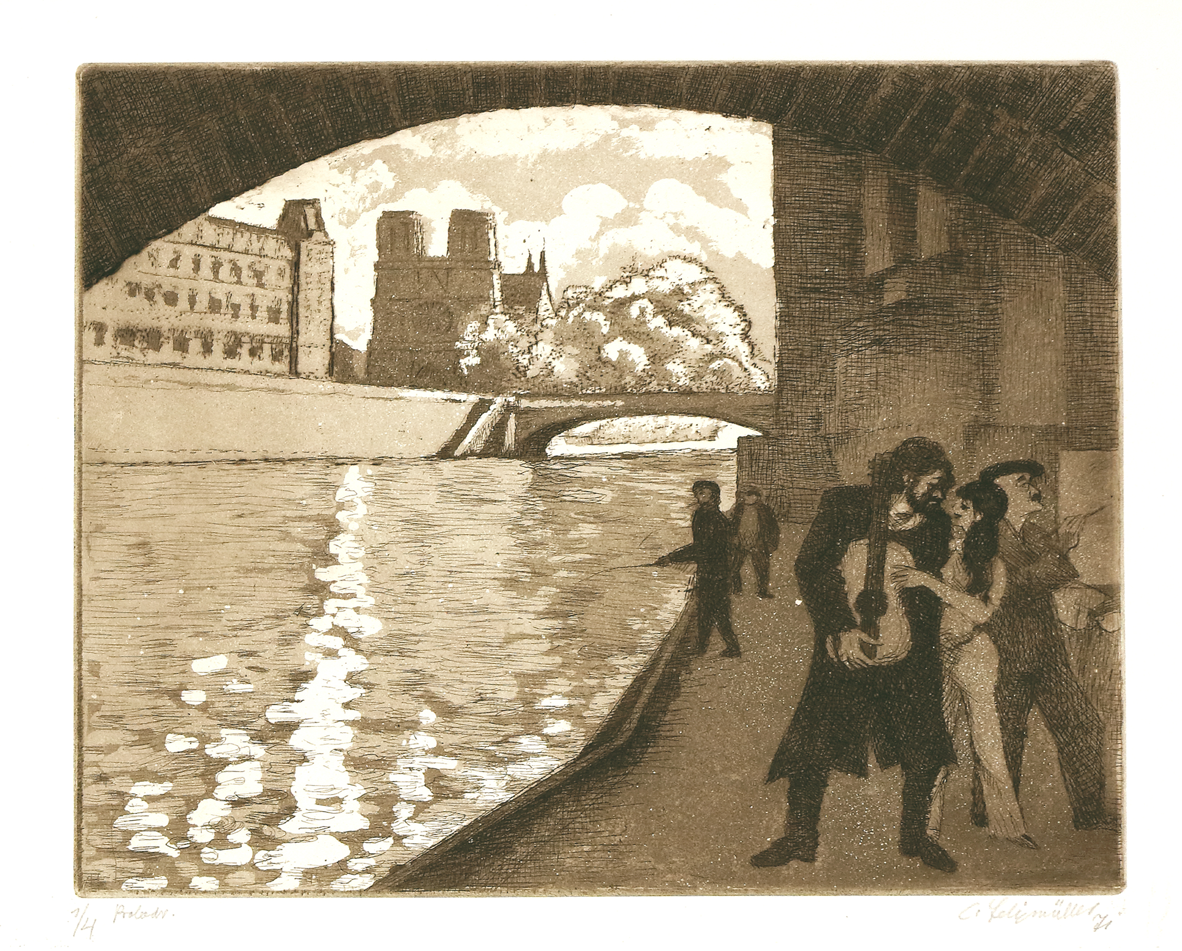 Paris, unter Mont Michel (mit dem Selbstbildnis des Künstlers). 1971. Radierung (Strichätzung und Aquatinta) in braun auf weißem Büttenpapier. 22,5 x 28,5 cm, Bg. 33,5 x 45 cm. Signiert, datiert und nummeriert 1/4 Probedruck. -WVZ 661. (1012-7)