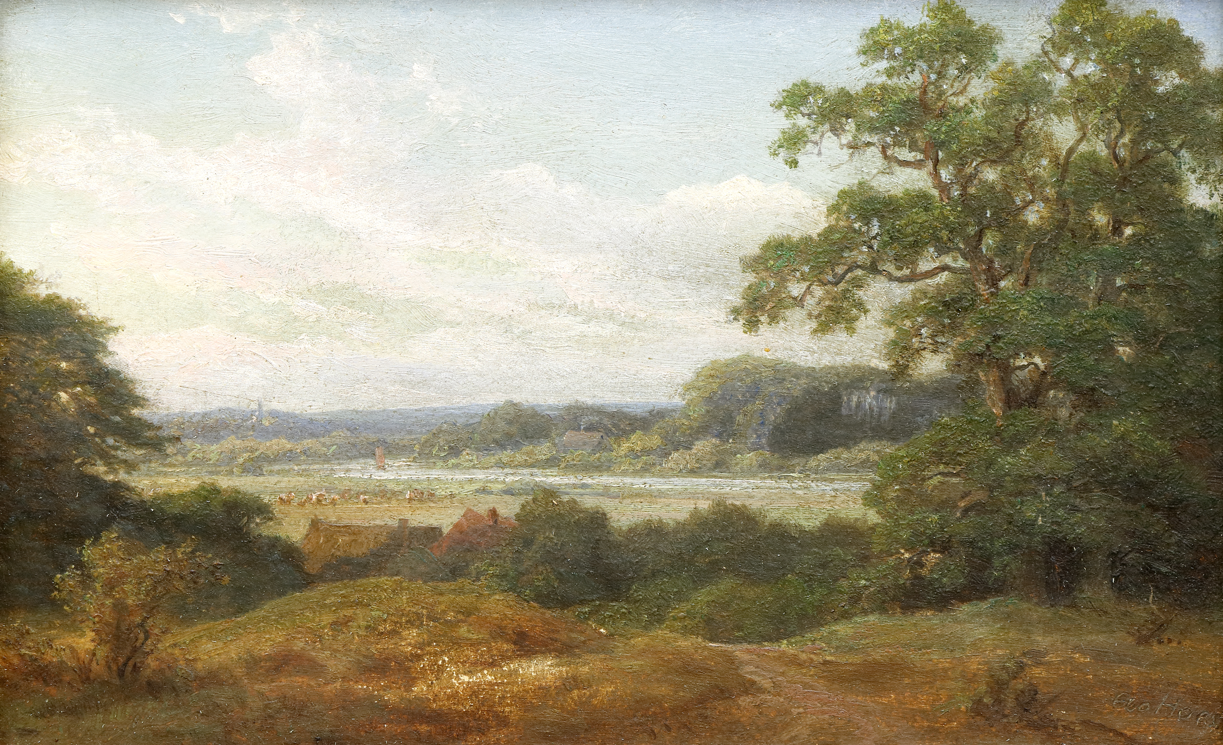 Weite Landschaft. Öl auf Malkarton. 18 x 27 cm. Rechts unten signiert sowie rückseitig alt bezeichnet. Gerahmt. (1013-1)