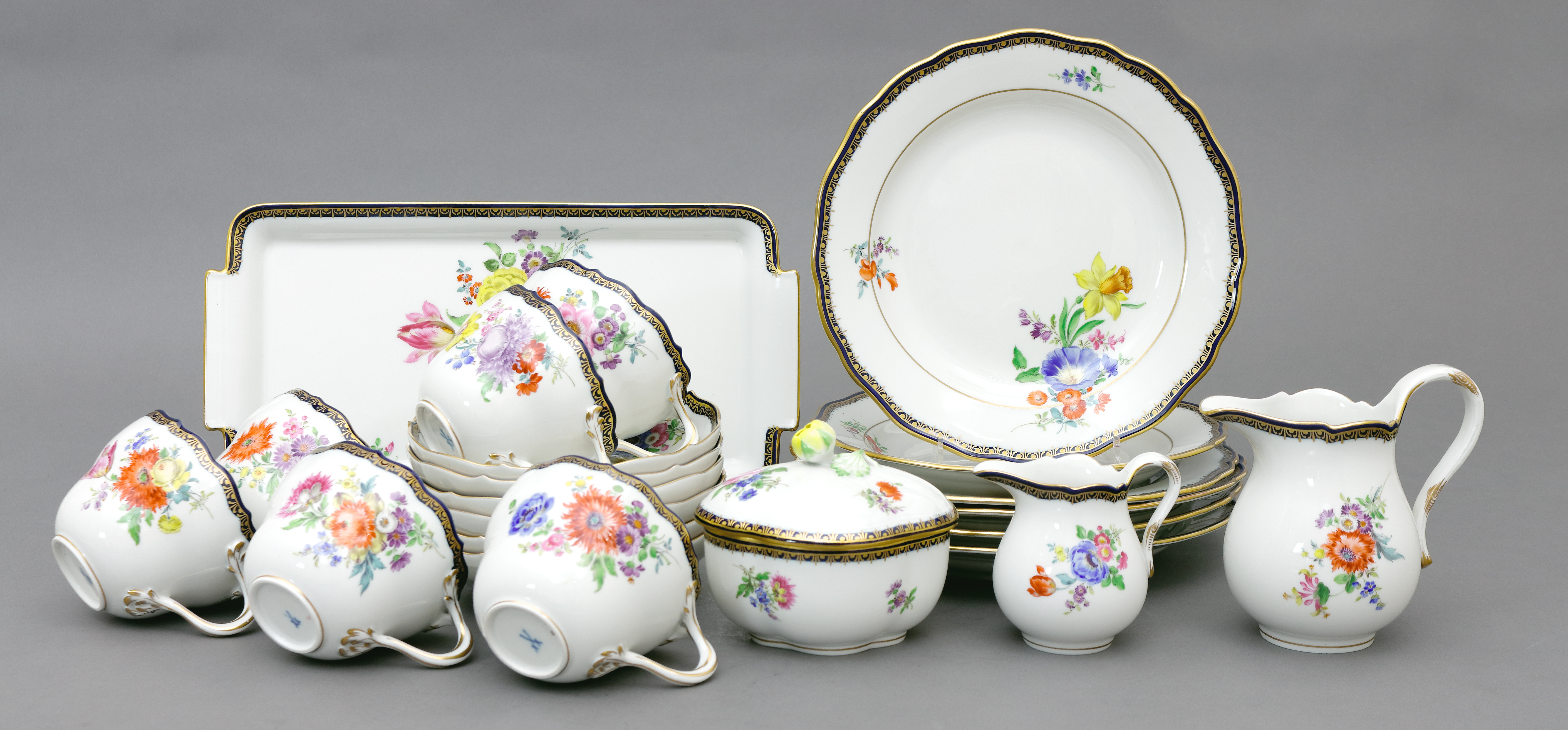Aus dem Service "Neuer Ausschnitt". Bunt gemalt mit Blumen, kobaltblauer Rand mit Goldstaffage, Goldrand. Bestehend aus 6 Gedecken, rechteckiger Kuchenplatte, 2 Milchkännchen und Zuckerdose. Blaue Schwertermarke, 1. Wahl. (1015-1)