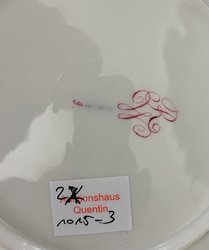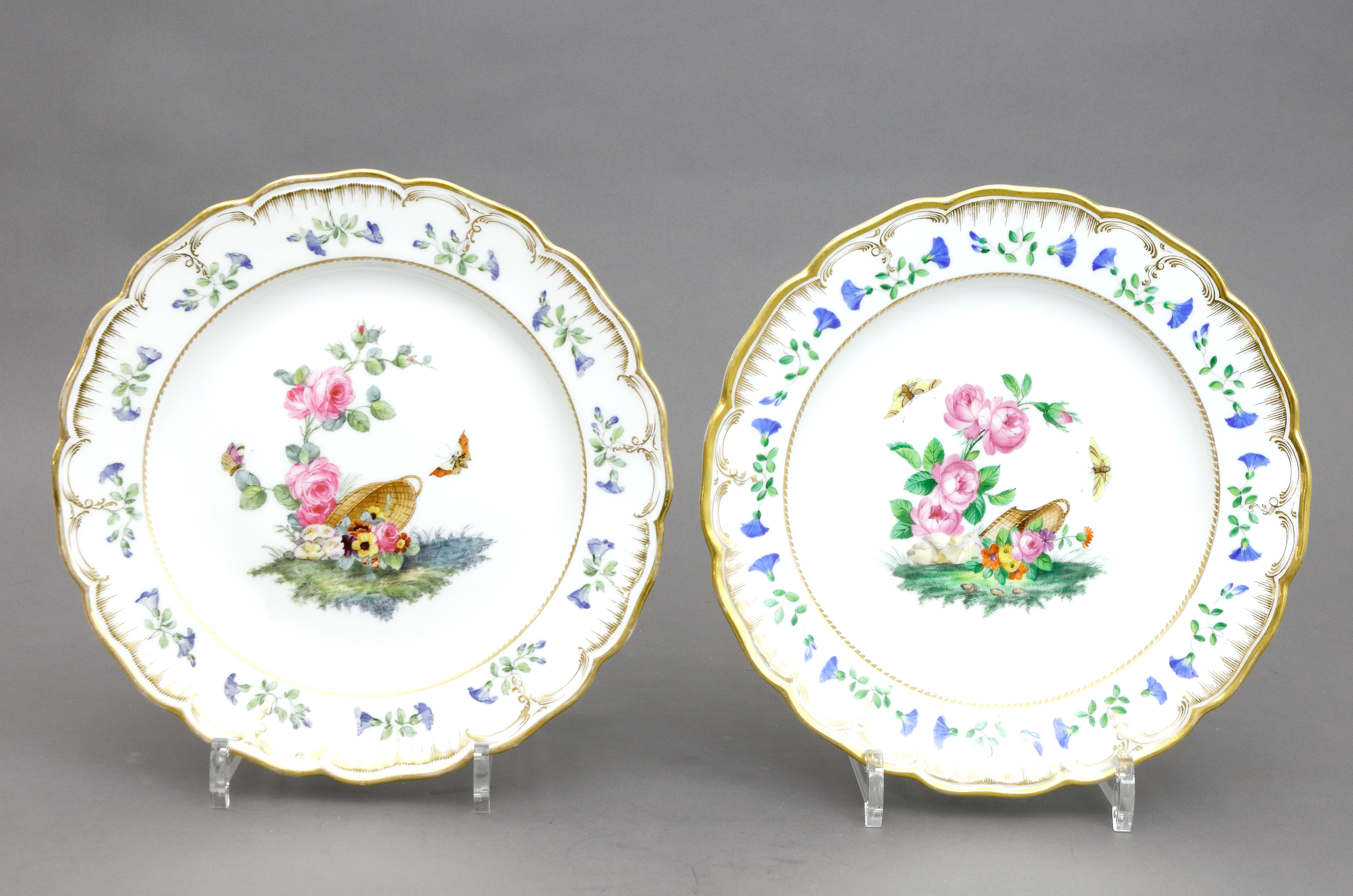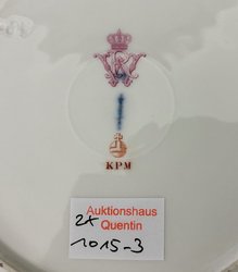 Aus dem Service "Neuglatt". Ergänzung zu dem 1770/72 für König Friedrich II. von Preußen für das Schloß Charlottenburg gefertigten Service "mit umgekipptem Blumenkorb". Auf der Fahne blaue Ackerwinden, Spiegel mit umgestürztem Blumenkorb auf Rasenstück, daneben purpurner Rosen und Kalitten. D 25 cm. Blaue Zeptermarke, teils mit rotem Reichsapfel und Besitzermarke WR (Kaiser Wilhelm II., Berlin, 1871-1914). 1. Wahl. (1015-3)
