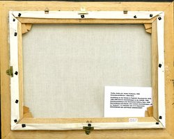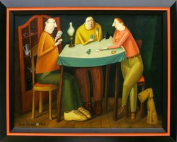 Das Kartenspiel. 1988. Öl auf Leinwand. 45 x 60 cm. Links unten signiert und datiert. Gerahmt. -Ausbildung an der Schule in Togliatti, Russland bis 1978. 1982-1986 diverse Ausstellungen in der UdSSR. 1989 Einzelausstellung in der Kolosseum Gallery, Rom. 1990 Übersiedlung nach Berlin, dort weitere Ausstellungen, z.B. im "Anderle", 111 Künstler mit 1111 Exponaten.  (1019-1)