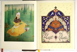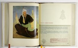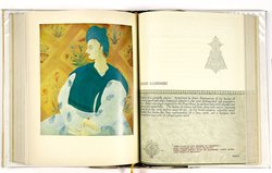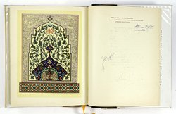 Poet of the East and Chughtai by Iqbal, M. & Chughtai, A.R., Nisar Art Press, Lahore, 1962. Folio, original boards and illustrated dust jacket, plastic wrap, illustrated endpapers. 476 pp, with 36 tipped-in colour plates, 25 black and white plates. Copy Number 163 from a limited de Lux Edition on Vellum of 275 copies. 14 x 111/4 x 2 in. (35,6 x 28,6 x 5,1 cm.). Signed from the artists. -Als Chughtai 29 Jahre alt war, veröffentlichte er eine prächtig illustrierte Ausgabe des Divan des berühmten Urdu-Dichters Ghalib unter dem Titel Muraqqa-i-Chughtai. Iqbal verfasste ein Vorwort zu dieser Publikation und beschrieb sie als "ein einzigartiges Werk in der modernen indischen Malerei und Druckgrafik". "Jetzt, da sowohl der Künstler als auch seine Kunst ihre Reife erreicht haben, hat er den praktischen Idealismus Iqbals mit der Magie seines Pinsels in seinem Werk heraufbeschworen, das als sein Meisterwerk gelten kann." (Justice S., A. R. Rahman in "Poet of the East and Chughtai", Nisar Art Press, Lahore, 1962, S. 1).  (1025-1)