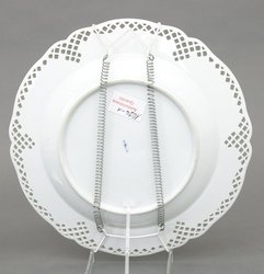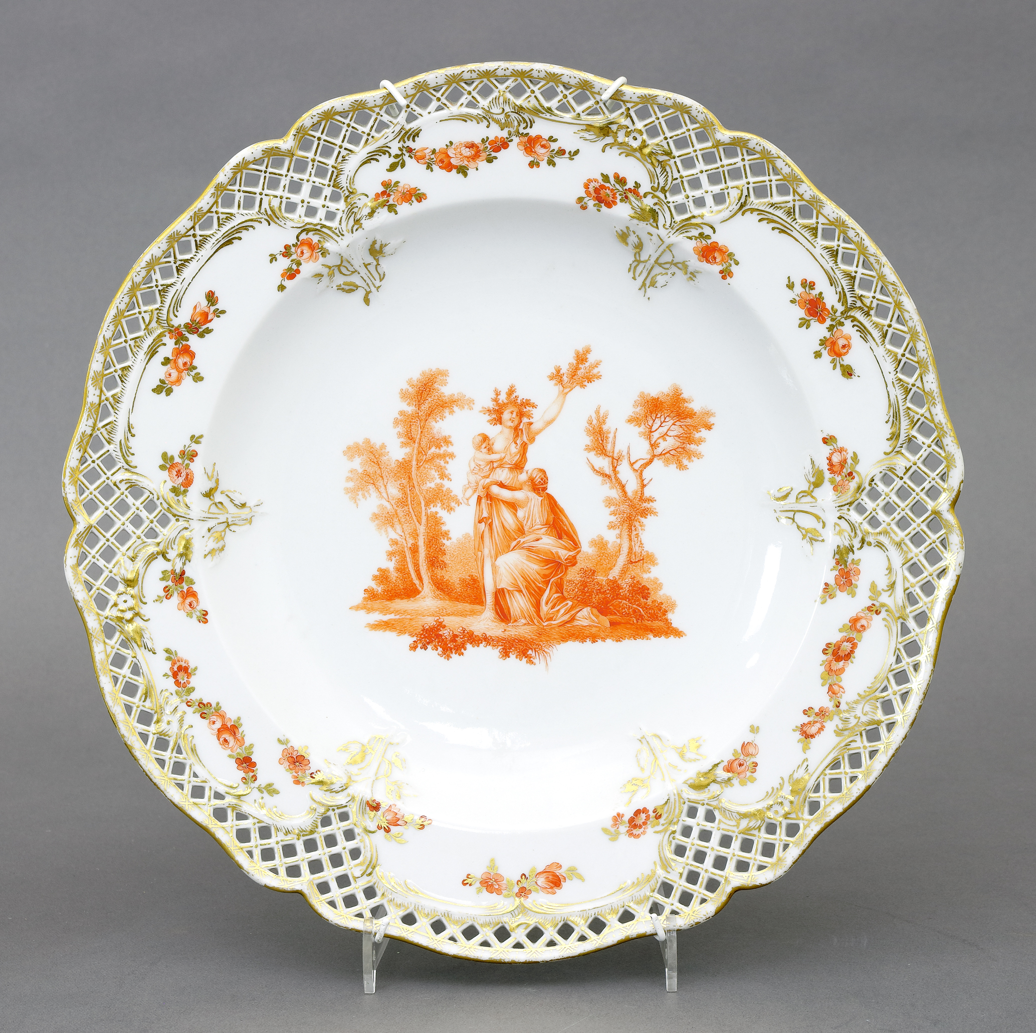 Aus dem Tafelservice mit mythologischen Darstellungen für König Friedrich II. Vergoldete Durchbruchfahne mit anhängenden Röschen und Blättern. Spiegel mit Darstellung aus der griechischen Mythologie in Eisenrot-Camaieu. Die Geschichte von Daphne, einer Nymphe, wird erzählt, die sich in einen Lorbeerbaum verwandelt, um der Verfolgung und dem Liebeswerben des Gottes Apollon zu entgehen. D 24,5 cm. Blaue Zeptermarke, Pressnummer 13. -Vgl. Köllmann II, Tafel 141/S.317. (1026-1)