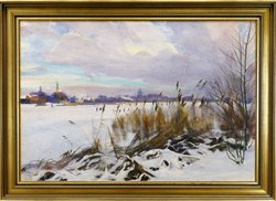 Winterlandschaft mit verschneitem Ufer und Schilf im Vordergrund. Im Hintergrund die Silhouette von Potsdam. Öl auf Leinwand, mit Platte hinterlegt. 57 x 83,5 cm. Gerahmt. (1028-1)