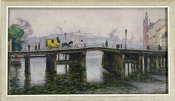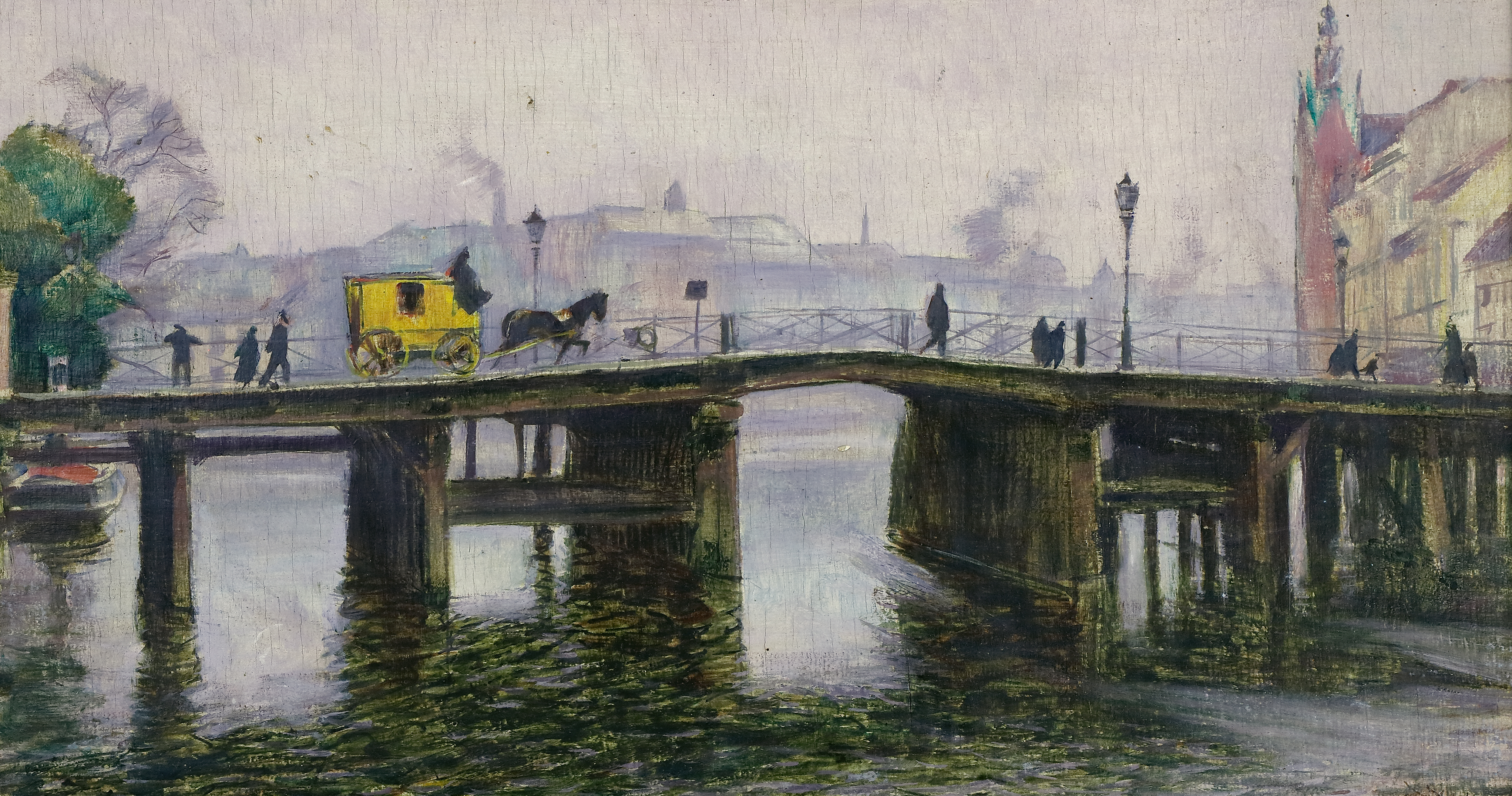 Die alte Insel-Brücke in Alt-Berlin mit einer gelben Droschke und Passanten. Öl auf Platte. 26 x 47 cm. Rechts unten signiert. Gerahmt. (1028-12)