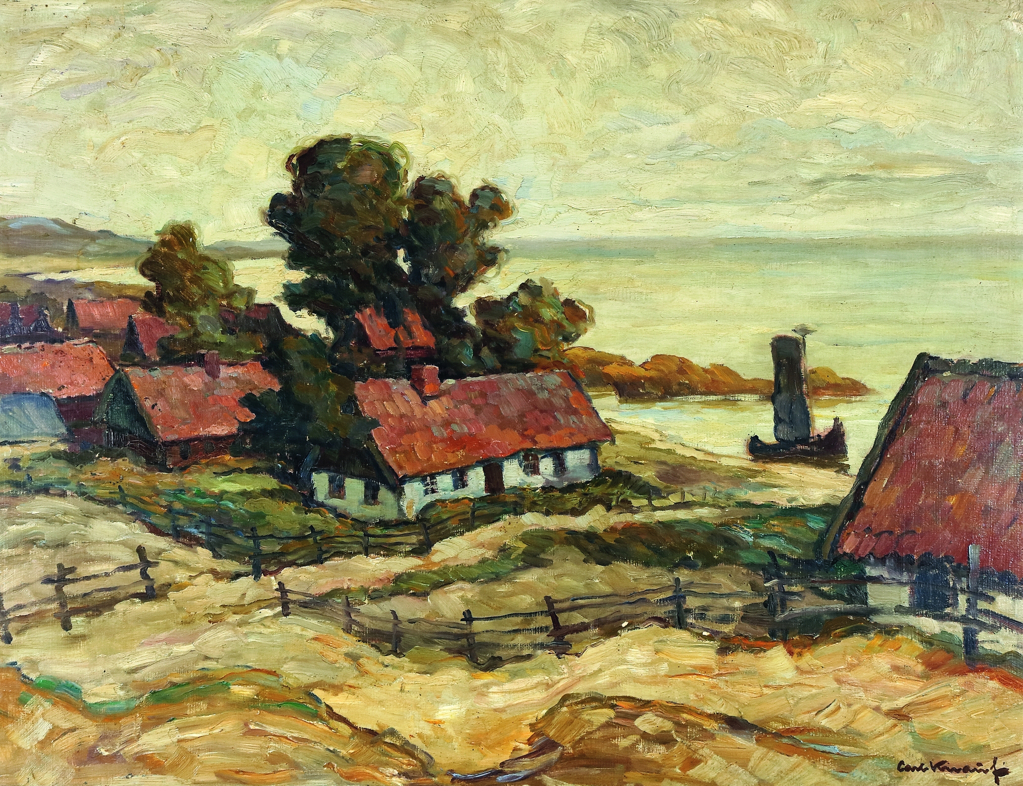 Ostseelandschaft mit Fischerhäusern, wohl bei Nidden an der Kurischen Nehrung. Öl auf Leinwand. 62 x 80,3 cm. Rechts unten signiert. Gerahmt. -Zu den beliebtesten Künstlertreffpunkten an der Nehrung gehörte der Ort Nidden. Dort trafen sich u.a. Schmidt-Rottluff, Oskar Moll, Thomas Mann und Walter Heymann. Auch Karl Knauf lebte und arbeitete dort, bis der Krieg alles beendete. Sein ehemaliges Wohnhaus ist heute ein Museum. (1028-3)