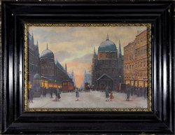 Straßenszene, wohl Budapest. Öl auf Malkarton. 40 x 56,5 cm. Rechts unten signiert. Gerahmt. (1029-1)