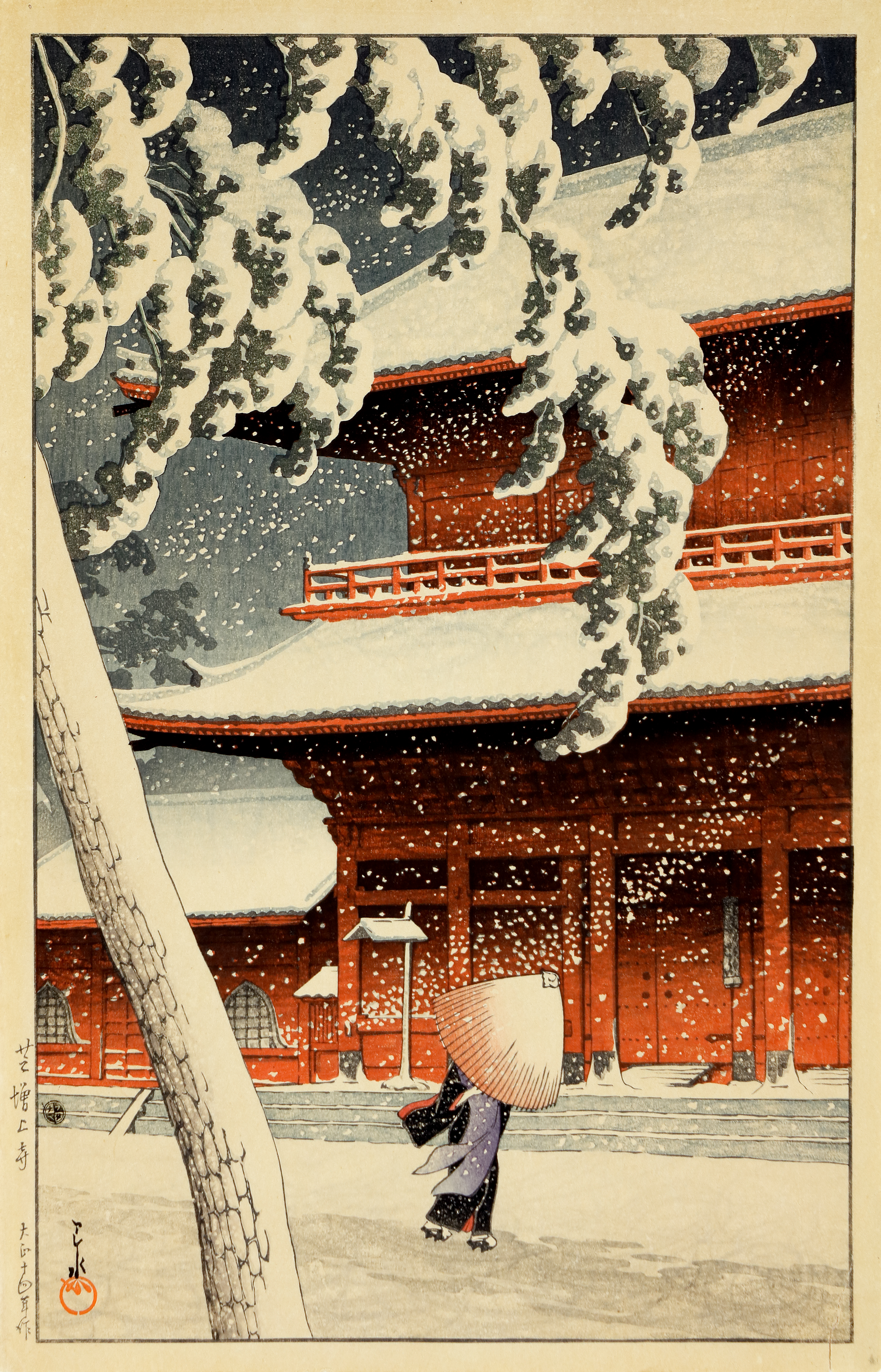 Shiba Zojoji (Zojoji Temple, Shiba) (1925). Farbholzschnitt auf Japan. 38 x 26 cm. Signaturstempel. Datiert: Taisho 14. Jahr. Runde Verleger-Marke. Rechte untere Ecke beschädigt. Gebräunt. -Berühmtes Blatt. (1031-1)