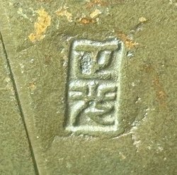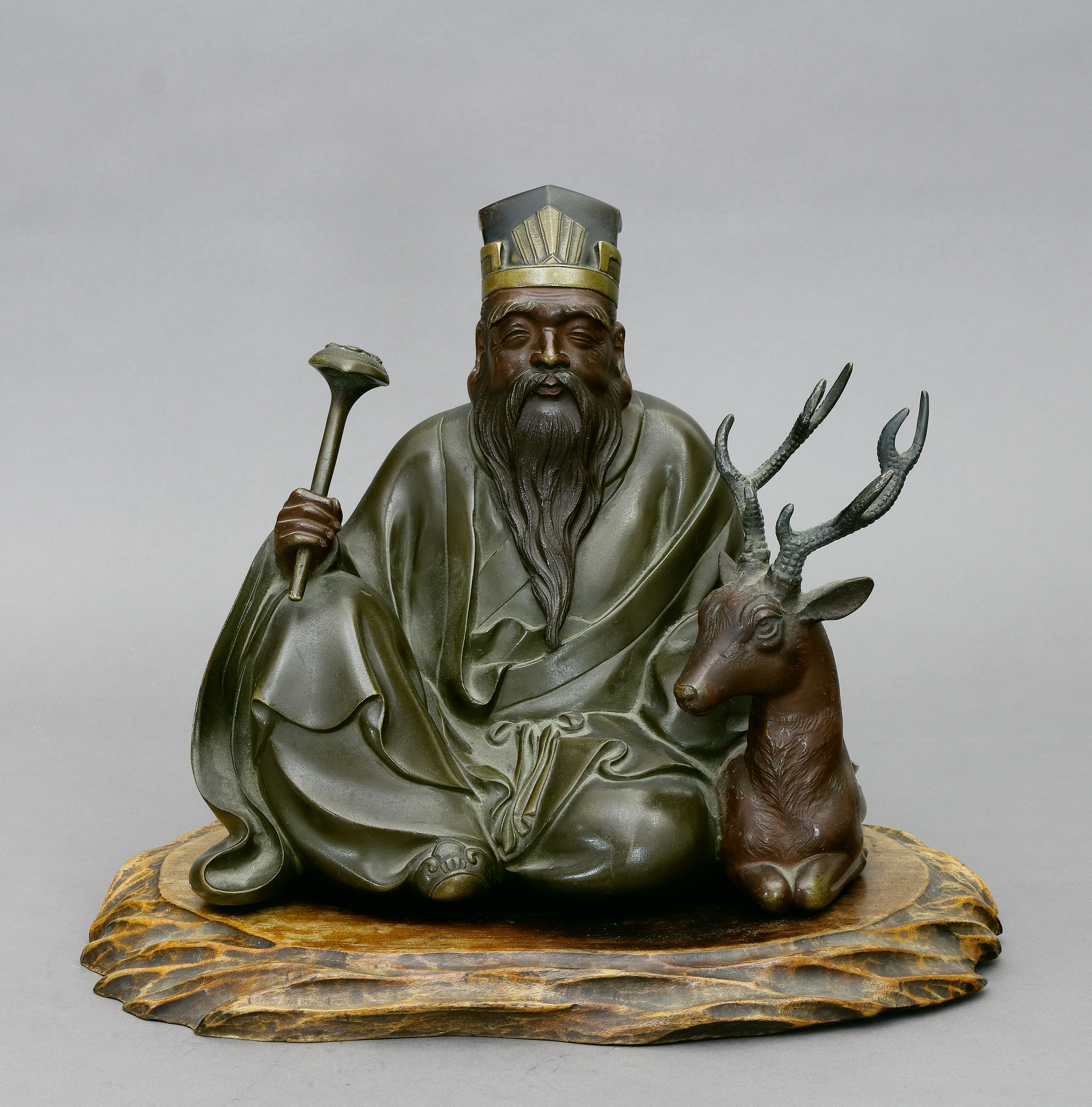 Gott der Langlebigkeit, einer der sieben Glücksgötter, dargestellt mit Hirsch und Zepter. Bronzefigur, lose auf Holzsockel. H 25 x B 25 x T 18 cm. Rückseitig mit Signaturstempel von Matsatsune. (1031-4)