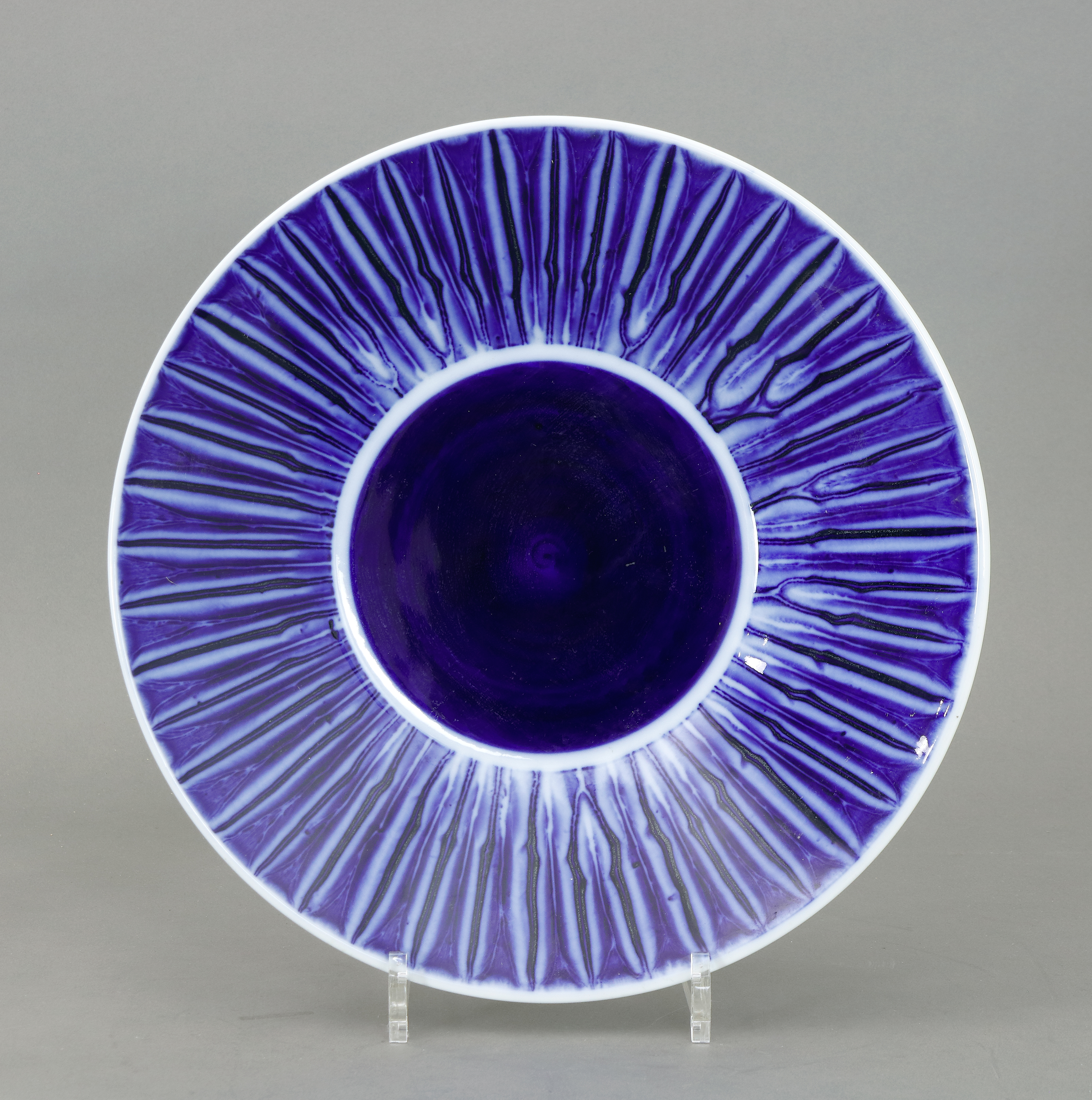 Aus dem Krokus-Tafelservice. Modellentwurf Hubert Griemert (1905 -1990), Modellbucheintrag April 1956, Modelln° 18550, Dekor 60/306 (Kobaltdekor Dunkle Sonne). Dekorentwurf Luise-Charlotte Koch April 1963. D 30,5 cm. Marken Zepter und Reichsapfel über KPM in Unterglasurblau. 1. Wahl. Tadellos erhalten. (1035-1)