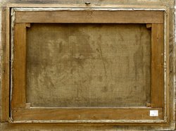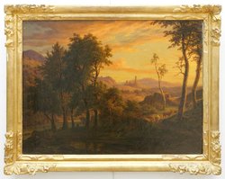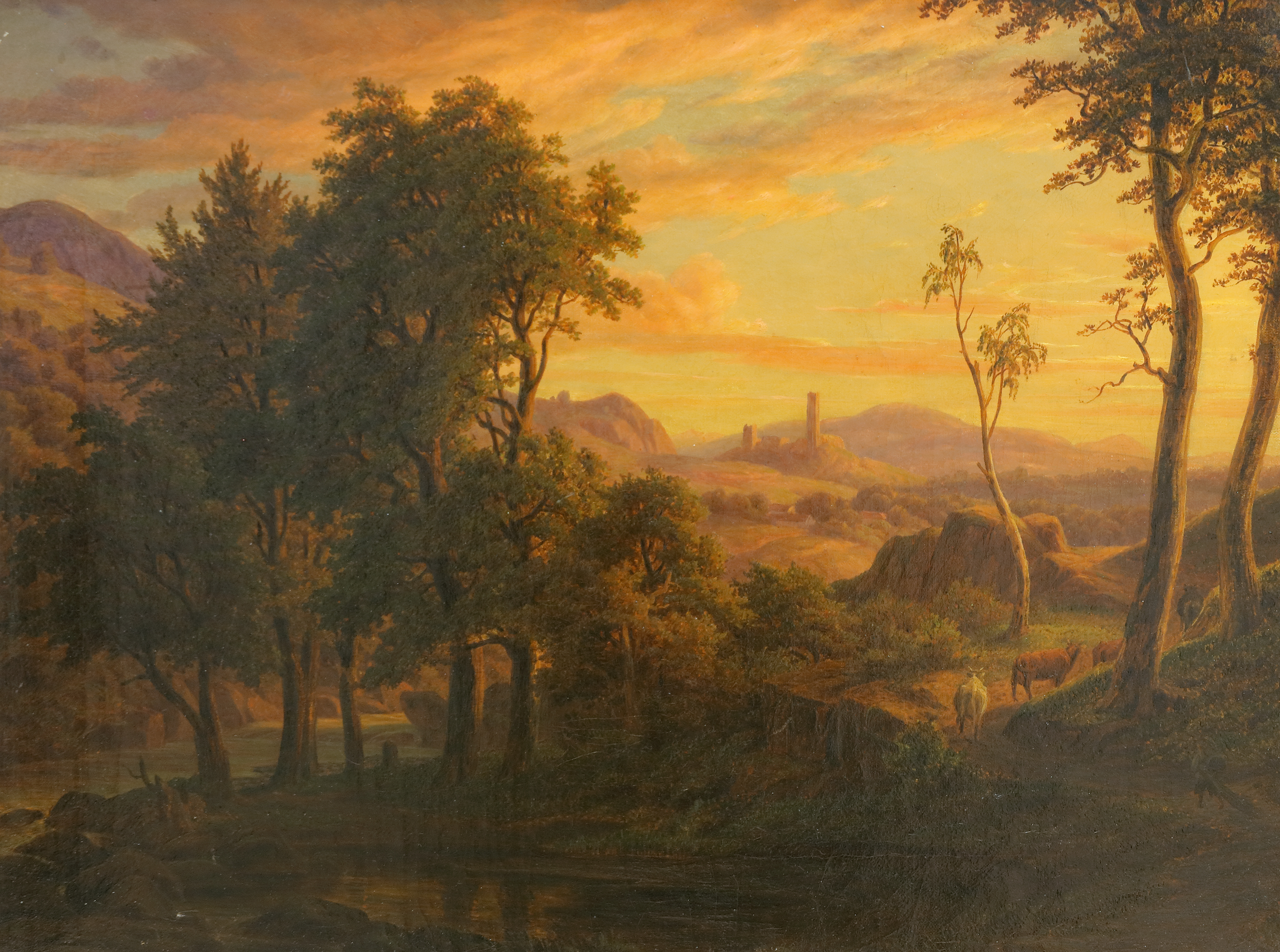 Weite Landschaft mit Bäumen, Rindern und Ruine bei Dämmerung. Öl auf Leinwand. 48,5 x 65 cm. Gerahmt. (1036-3)