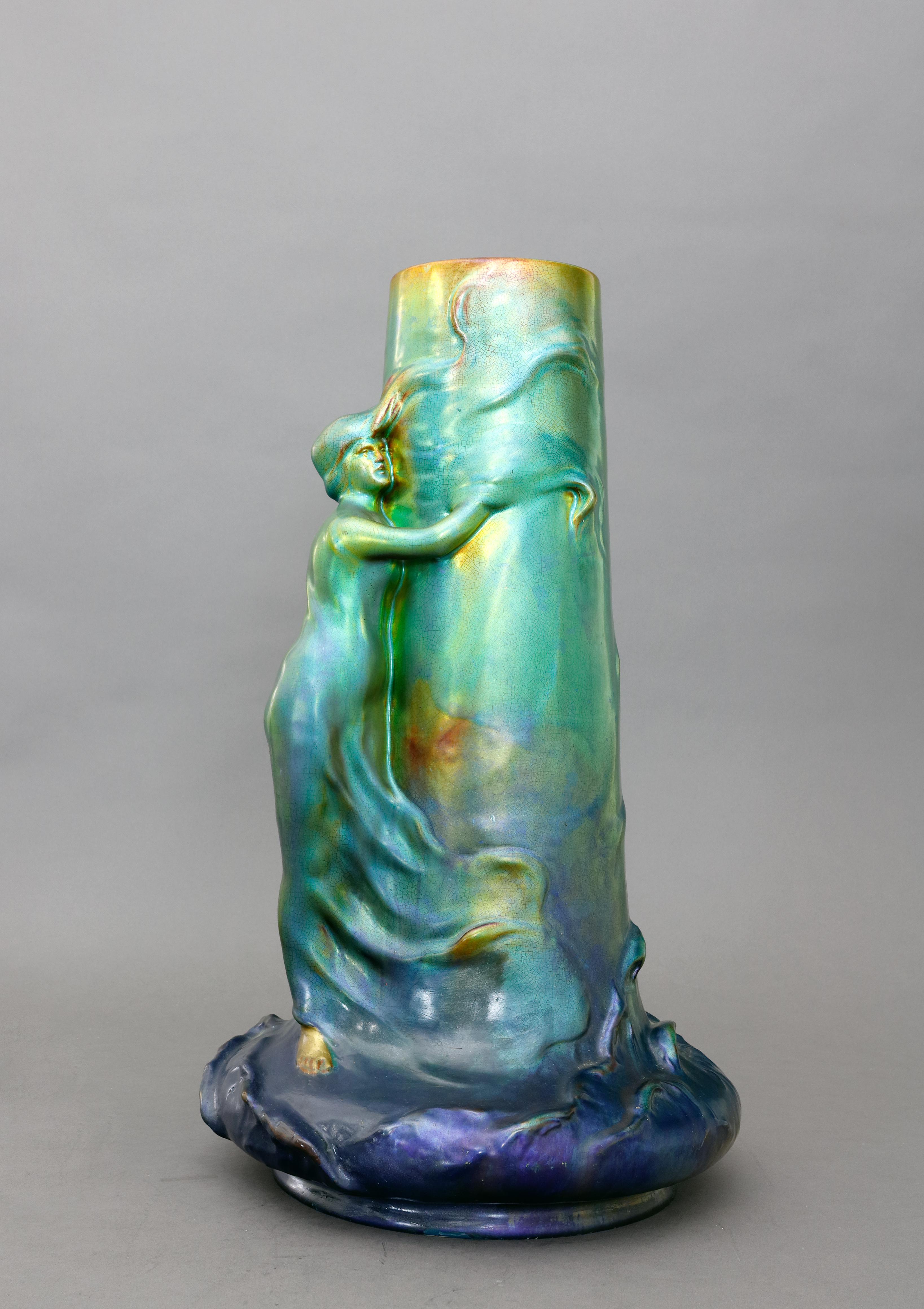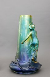 Grün-gelbe Eosinglasur, mit dem plastischen Dekor eines weiblichen Aktes mit Tuch. H ca. 43 cm. (1036-4)