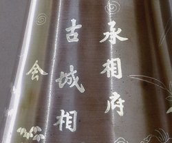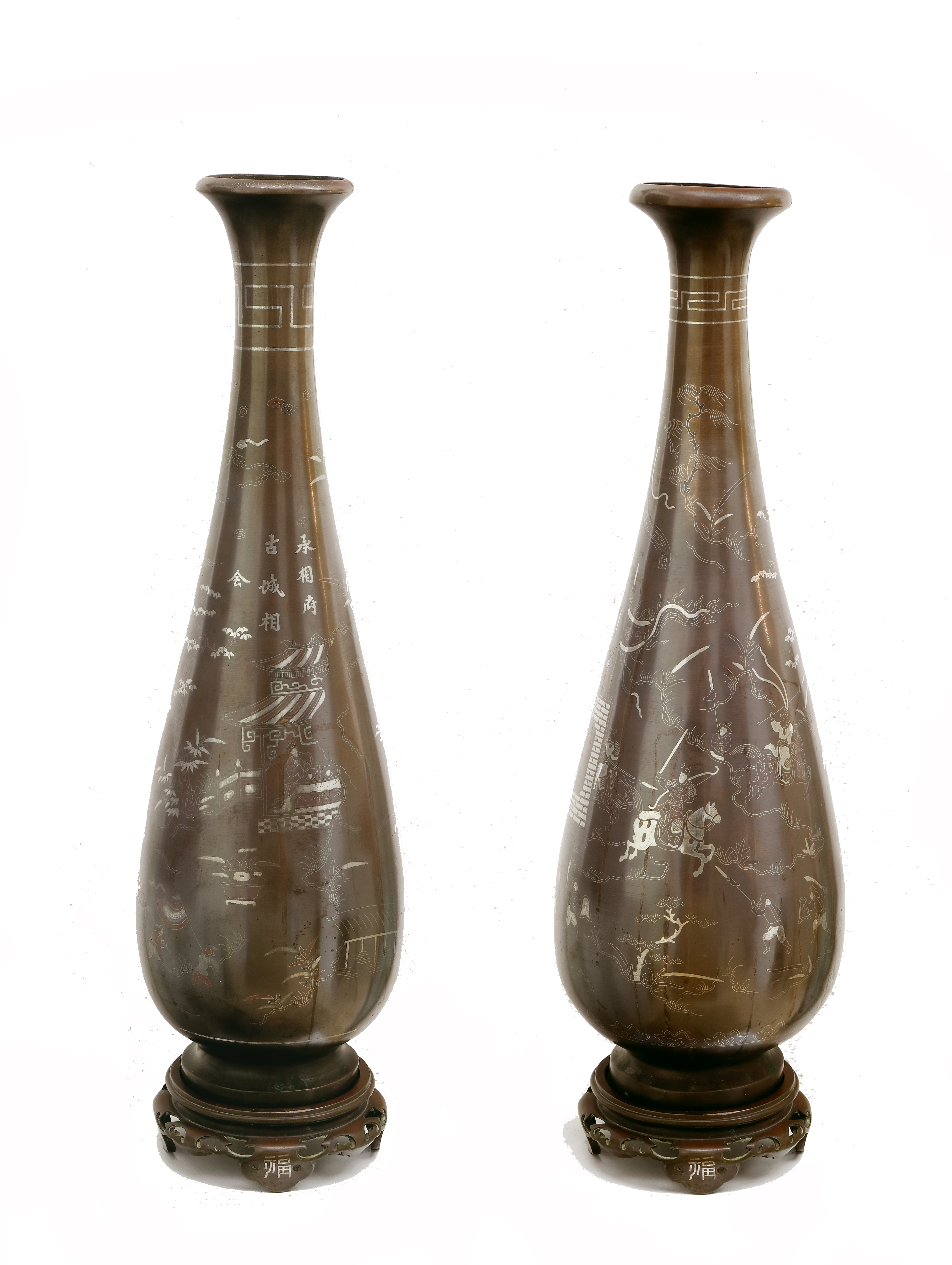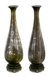 ein Paar Keulenform mit abgesetztem, rundem Stand auf Durchbruchstand. Silbertauschierung von Schriftzeichen (Minister Residenz, oder ewige Ministerresidenz, Alter Stadtminister), Pflanzen, kämpfenden Soldaten, und Gemäuer. Trompetenartige Öffnung mit silbernem Mäanderrand. H.: 63,5/68,5 cm. (1040-1)