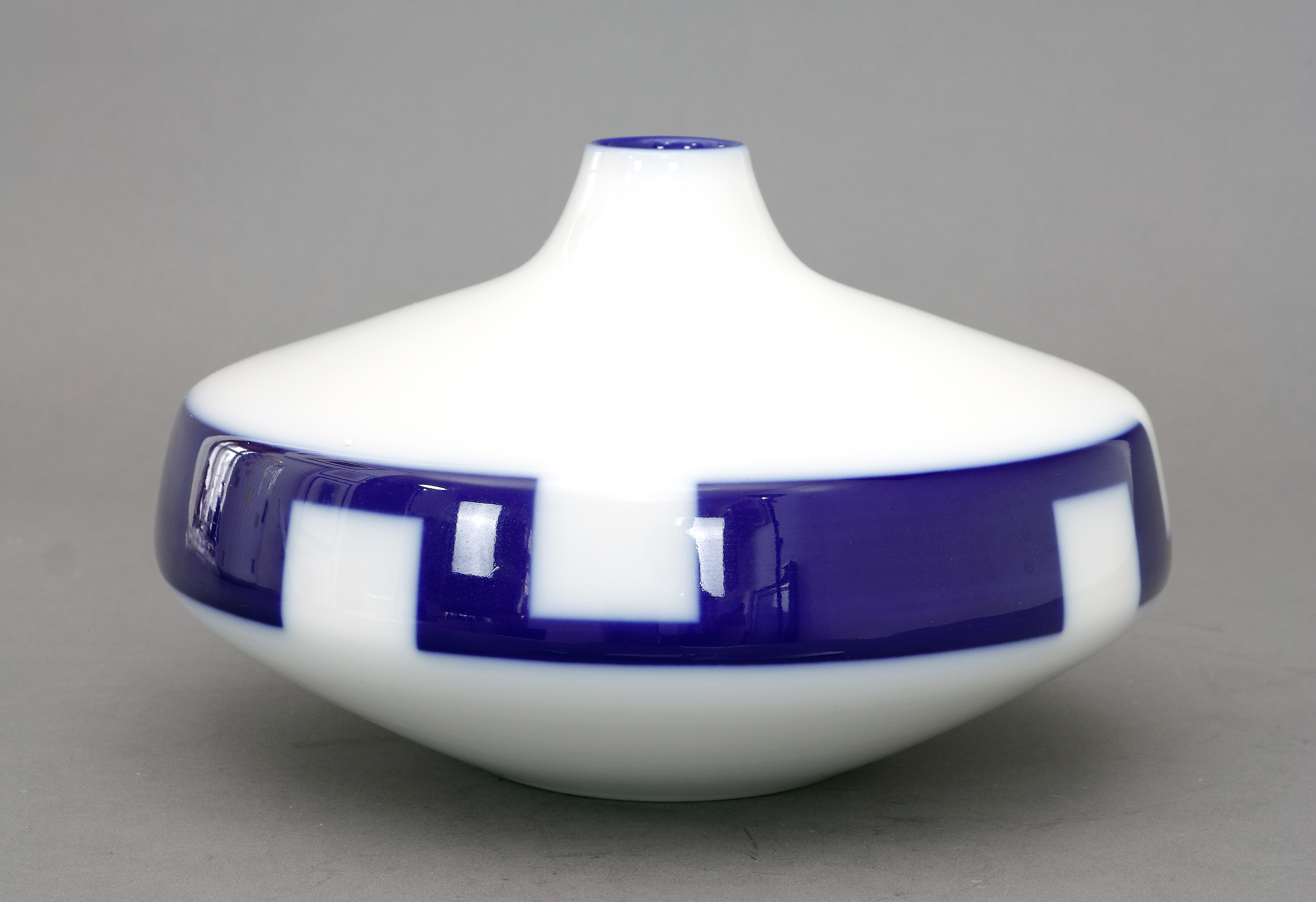 Modellentwurf Hubert Griemert Mai 1965. Modelln° 19945. Dekorentwurf Luise-Charlotte Koch März 1965. Porzellan, weiß mit kobaltblau. H 15,1 cm, D 23,7 cm. Blaue Zepter-und unterglasurblaue Reichapfelmarke. (1040-4)