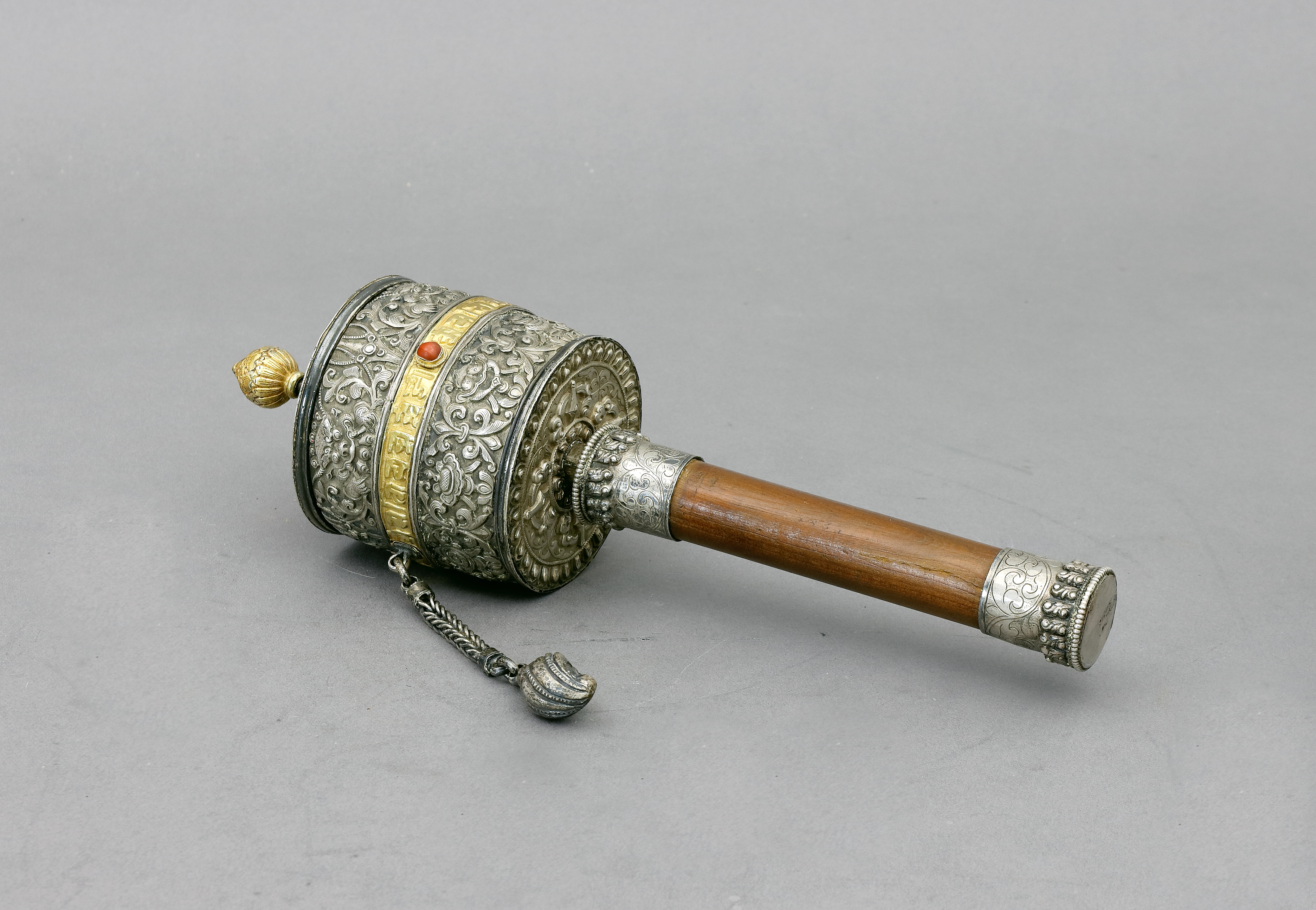 Aus dem Besitz des von den Chinesen eingesetztem Gegen -Dalai Lama. So, eine Notiz, von 1966, die sich im Inneren der Gebetsmühle befindet, neben den Mantras und Gebeten. L 26 cm. Silber und Gold, Säure geprüft. (1042-1)