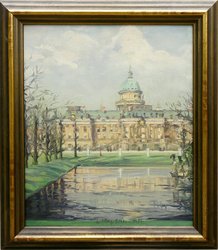 Potsdam, Stadtschloss und Karpfenteich, am rechten Rand der Neptunbrunnen. Potsdam. 1927. Öl auf Leinwand. 55,5 x 46,5 cm. Mittig unten signiert und datiert. Gerahmt. (1050-1)