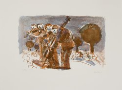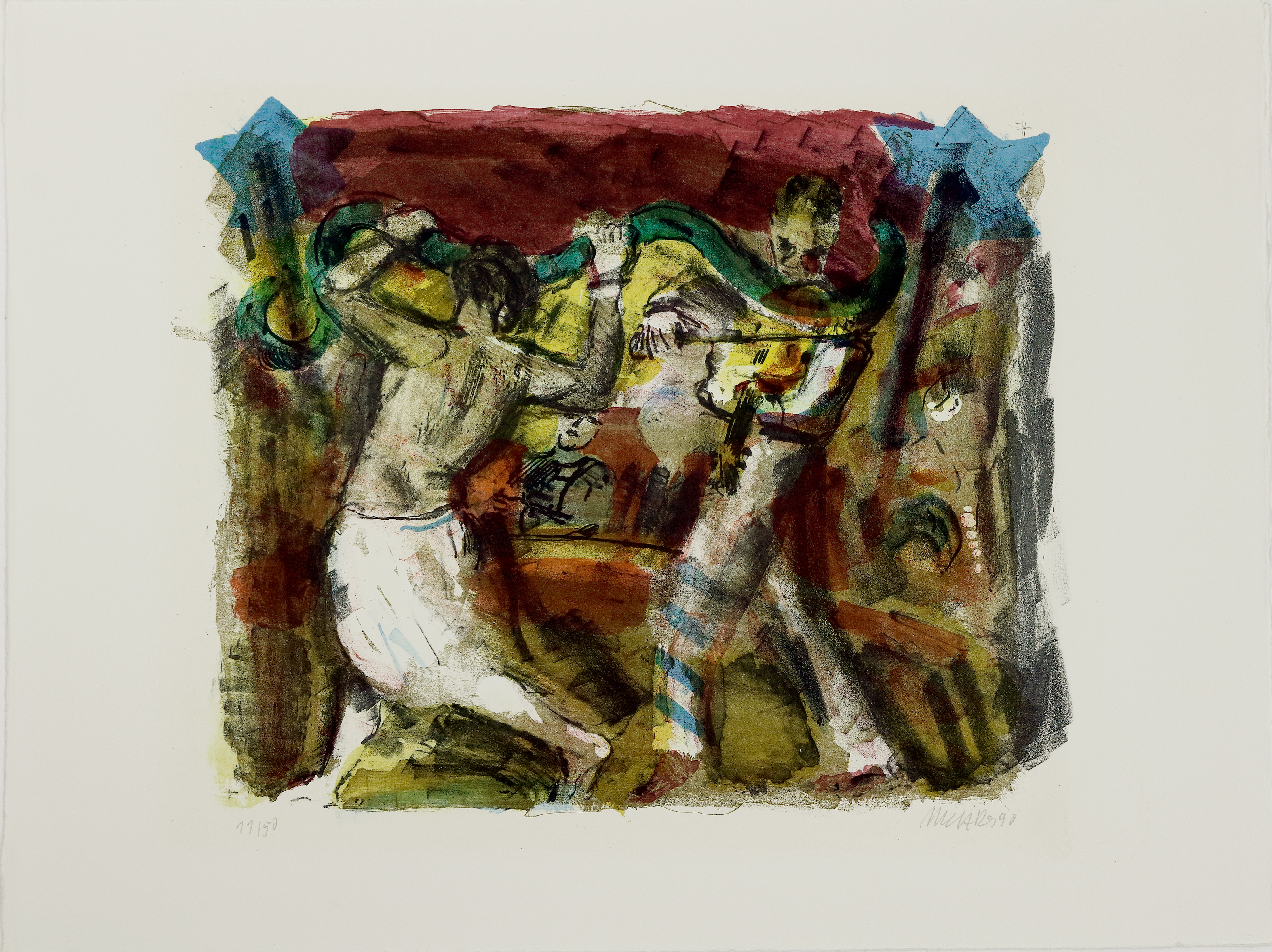 Hommage a Kurt Schwaen. 10 Farblithografien zum Thema Musik. Orig.-HLwd.-Kassette mit 10 signierten und nummerierten Farblithografien. Berlin, Edition Manfred Schmidt, 1990. Quer Groß Folio. Friedrichshagener Presse, Mappe Nr. 1. Im Impressum nummeriert 11 (GA 50). (1052-5)