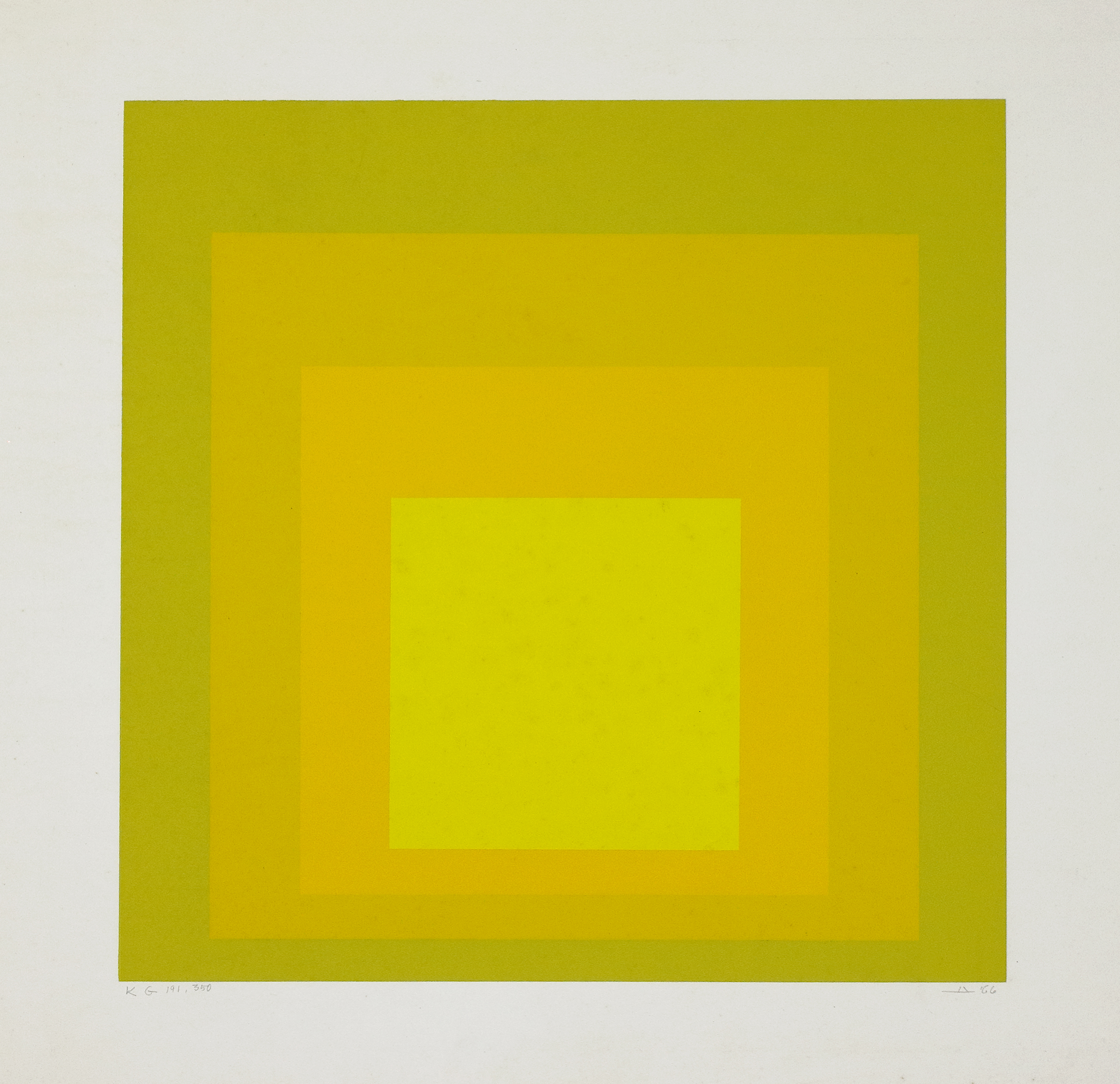Hommage to the square (1966). Farbserigraphie, 28 x 28,2 cm, Bg. 39,5 x 38,5 cm. Signiert, datiert und bezeichnet KG 19, 350. herausgegeben von der Kestner Gesellschaft, Hannover. Gedruckt bei Ives-Sillman, New Haven. Unauffällige Gebrauchsspuren, einige kleine Kratzspuren.  (1053-2)