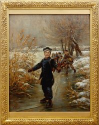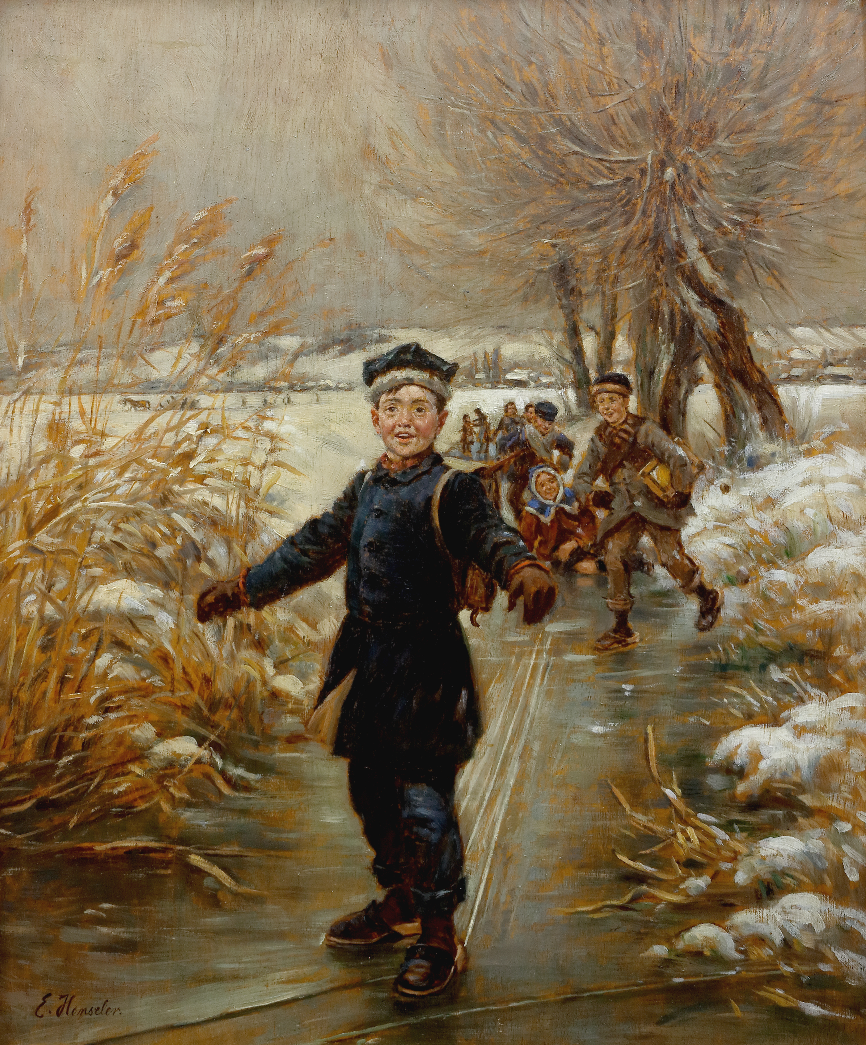 Ländlicher Sport im Wepritzer Bruch. 1889. Öl auf Sperrholz. 60,5 x 50,5 cm. Links unten signiert sowie rückseitig bezeichnet "Ländlicher Sport". Gerahmt. -Henseler studierte in Berlin und Weimar bei Karl Gussow, Albert Bauer und Albert Brendel. Er stellte von 1877-92 auf den Großen Berliner Kunstausstellungen aus, 1879 -1917 im Münchner Glaspalast. Er war Mitglied des Vereins Berliner Künstler. -Lit.: Gerhard Boese. E. Henseler der Maler aus Wepritz an der Warthe. Aus seinem Leben, Werkkatalog und Ausstellungen, Konz bei Trier, 2016, S. 65, N° 133.-"Winterlandschaft mit Weiden, dem Dorf und die Berghöhen von Wepritz -die Wepritzer Alpen. Kinder, von der Schule kommende, schlittern in Holzpantinen auf zugefrorenem Wassergraben". -Provenienz: Aus dem Nachlass 1972; Privatbesitz Bad Salzuflen seit 2010. (1054-1)