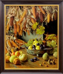 Stillleben mit Mais und herbstlichen Früchten. Öl auf Holztafel. 60,5 x 50,5 cm. Links unten signiert. Gerahmt. -Abgebildet in: G. Boese, Werkkatalog, 2006, N° 350. (1054-2)