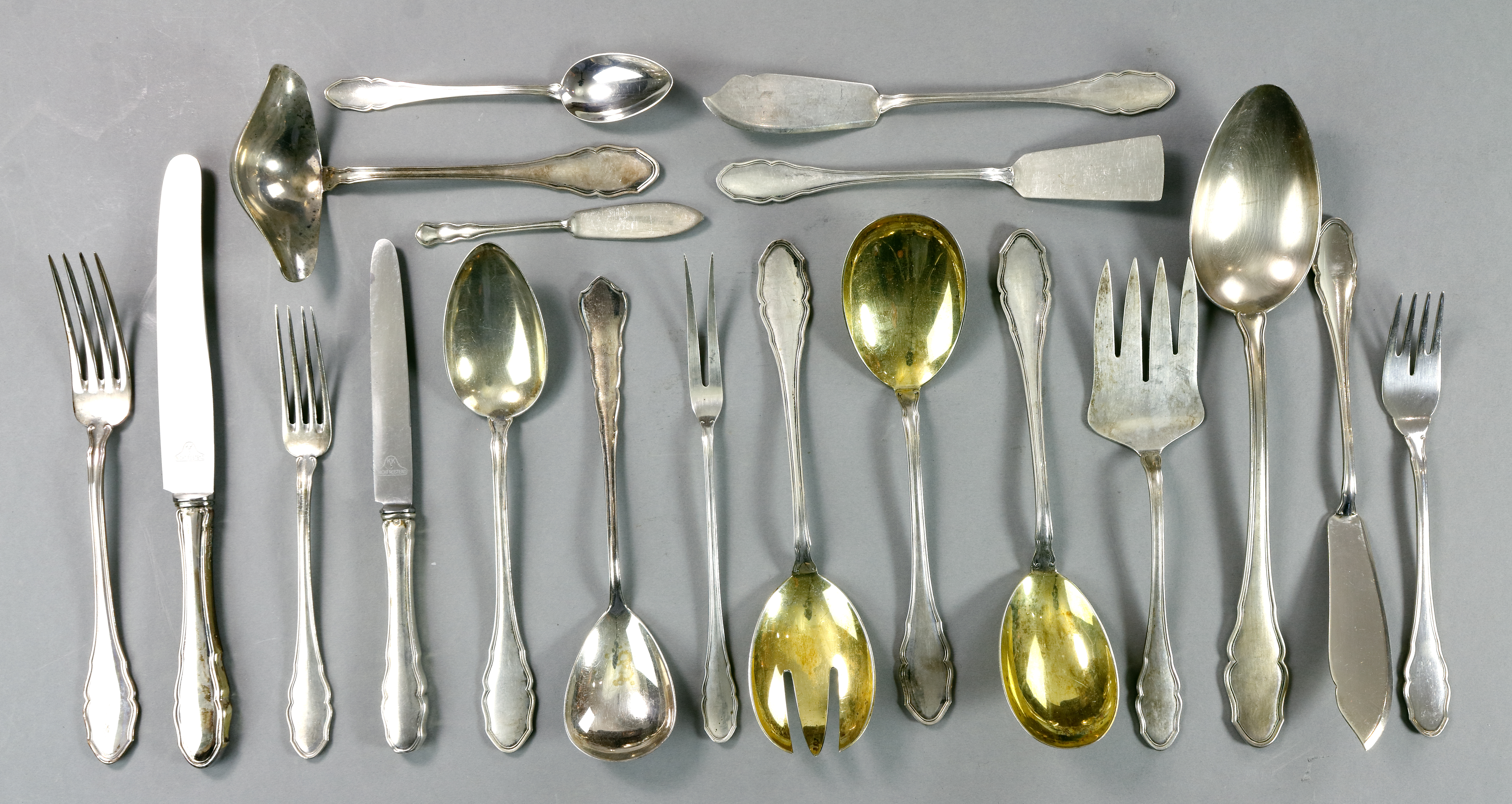 später WMF, ca. 114 Teile Bestehend aus 12 Gabeln, 12 gr. Messern, 12 gr. Löffeln, 12 mittleren Gabeln, 12 mittleren Messern, 12 Fischgabeln, 12 Fischmessern, 12 Kaffeelöffeln, 1 gr. Kelle, 1 Soßenkelle, 2 Fischvorlegeteilen, 2 Vorlegegabeln, 4 Vorlegeteilen, 2 gr. Vorlegelöffeln, 1 Salatbesteck, 2 Vorlegelöffeln mit vergoldeter Laffe sowie 2 mittleren Vorlegelöffeln. Gewicht ca. 4951 g (Messer mit 10 g berechnet). (1059-1)