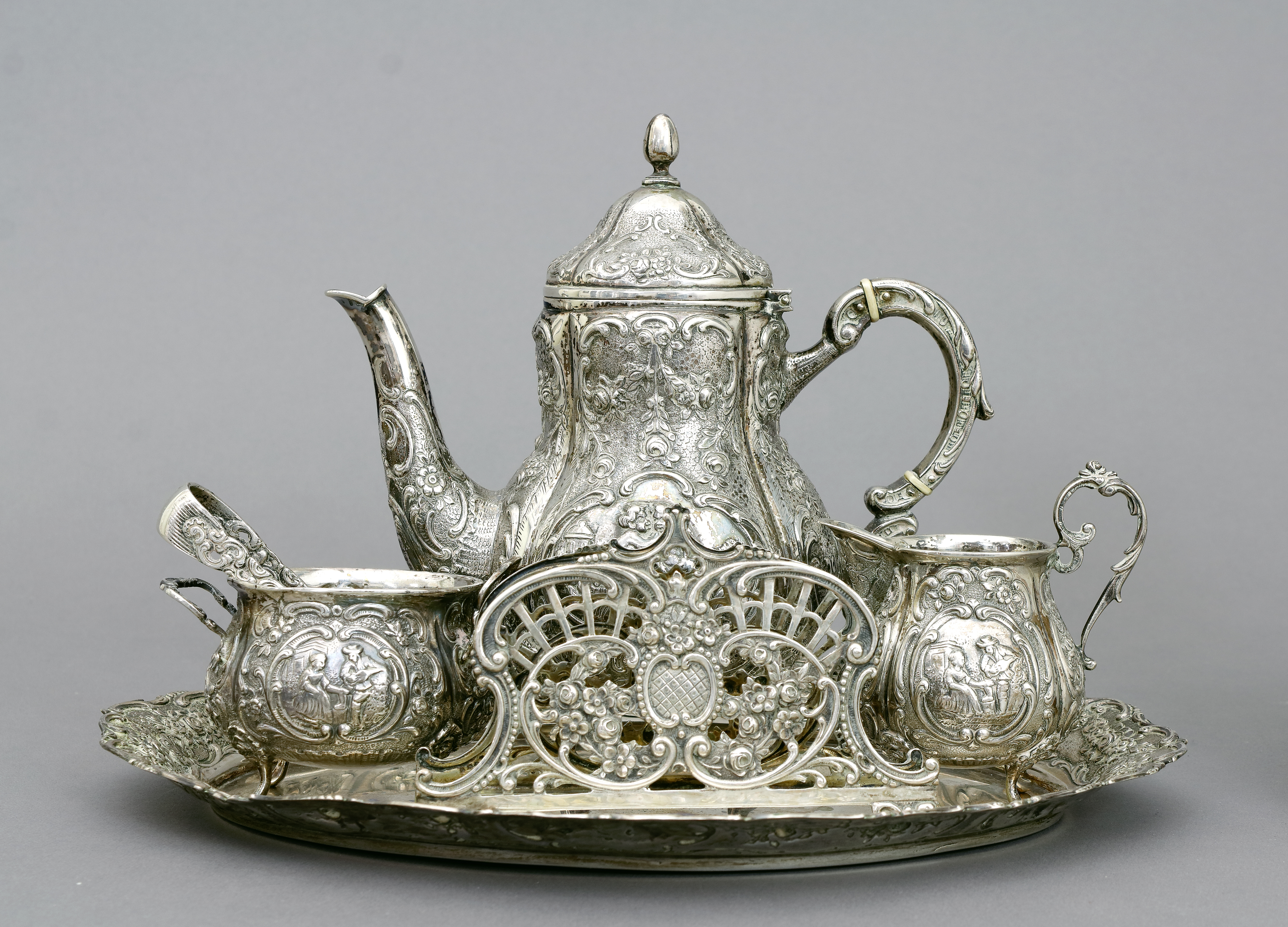 Bestehend aus Kanne, Milchkännchen, Zuckerschale, Zuckerzange, Serviettenhalter und Tablett (19 x 25 cm) mit Rocaillenrelief und Medaillons, teilweise Innenvergoldung. Gewicht ca. 809 g. Punzen: Halbmond, Krone und 800. (1059-2)