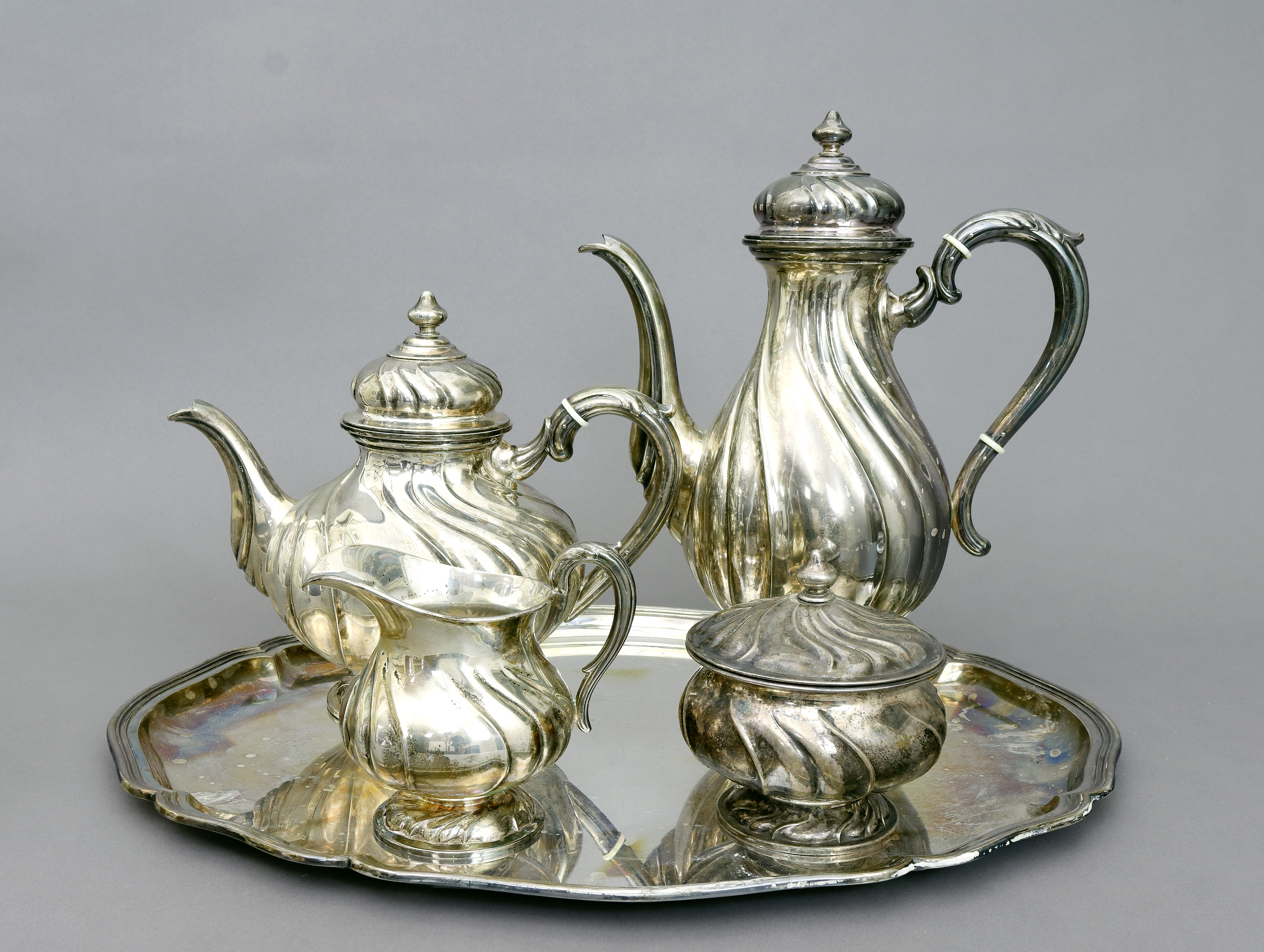 fünf Teile Bestehend aus Kaffeekanne, Teekanne, Milchkännchen, Zuckerdose, Balusterform mit godronierter Wand, scharnierten Haubendeckeln und passendem, ovalem Tablett mit gewelltem Profilrand, 45 x 35 cm. Gewicht zus. ca. 2770 g. (1059-3)