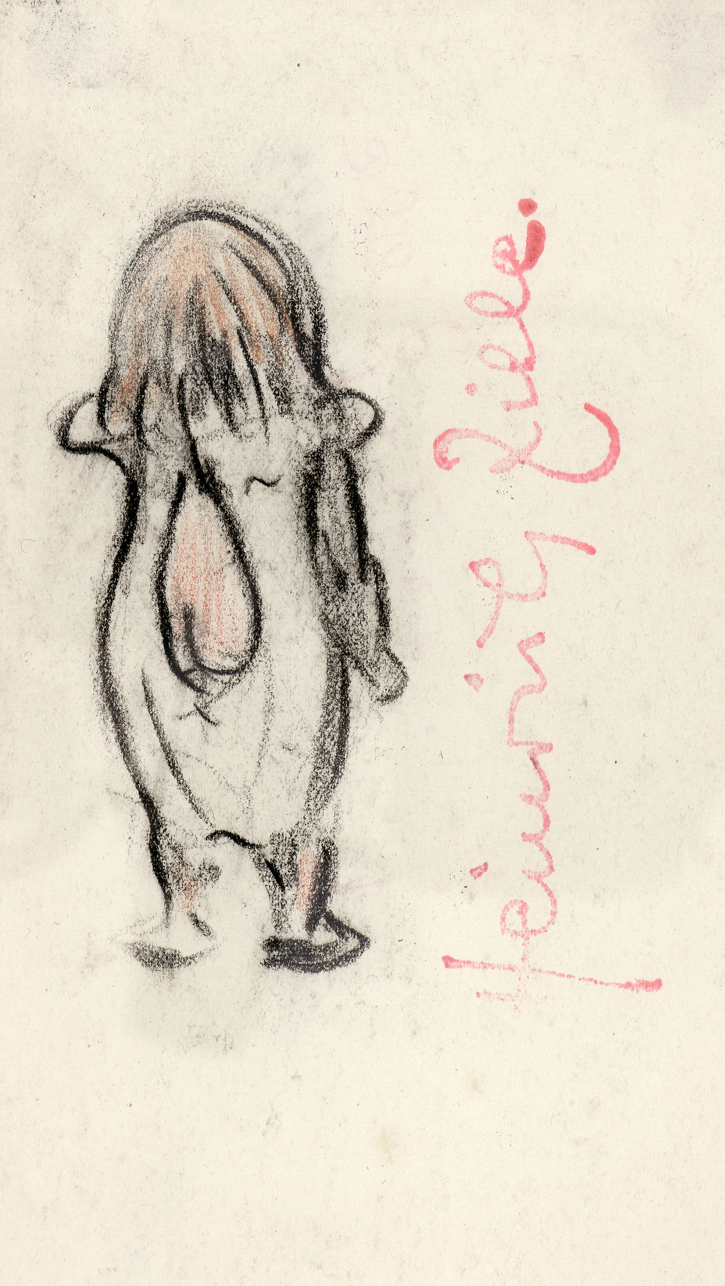 "Mutta, ick muß mal!" Kohle und Farbkreide auf Papier. 15 x 9 cm. Mit dem roten Nachlassstempel des Künstlers. Freiliegend im Passepartout, unter Glas gerahmt. - Provenienz: Schmidt, Dresden, 13. 9. 2014, Lot 692; Westdeutscher Privatbesitz. (1060-17)