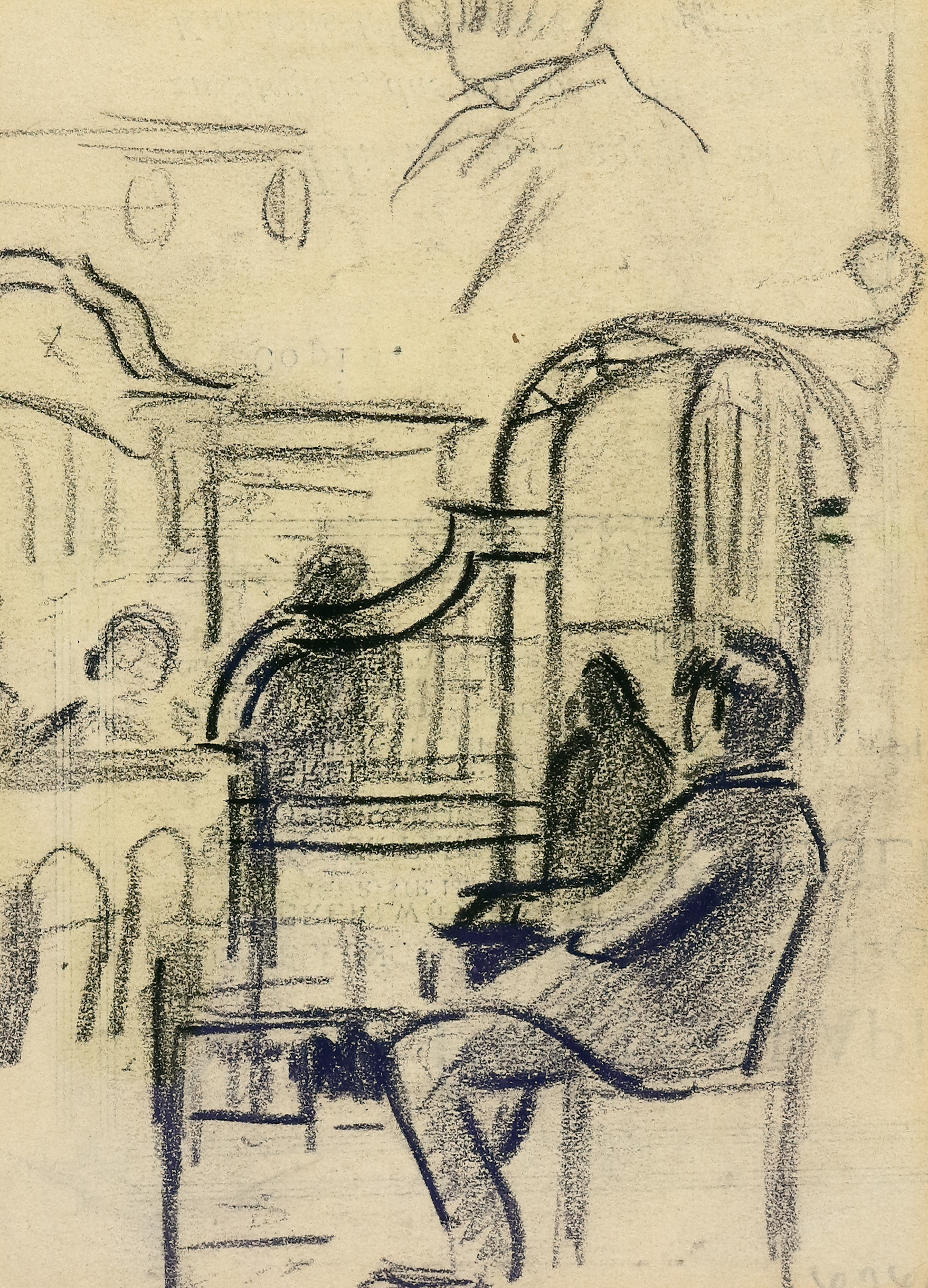 Cafébesucher. Kohlezeichnung auf Velin. 14,6 x 11,3 cm. Rückseitig auf dem Unterlagepapier mit dem roten Nachlassstempel (Rosenbach 4). Die Zeichnung auf der Rückseite eines Werbezettels. Rückseitig am oberen Rand auf dem Unterlagepapier montiert. Provenienz: Walter Zille. Gerahmt. (1060-20)