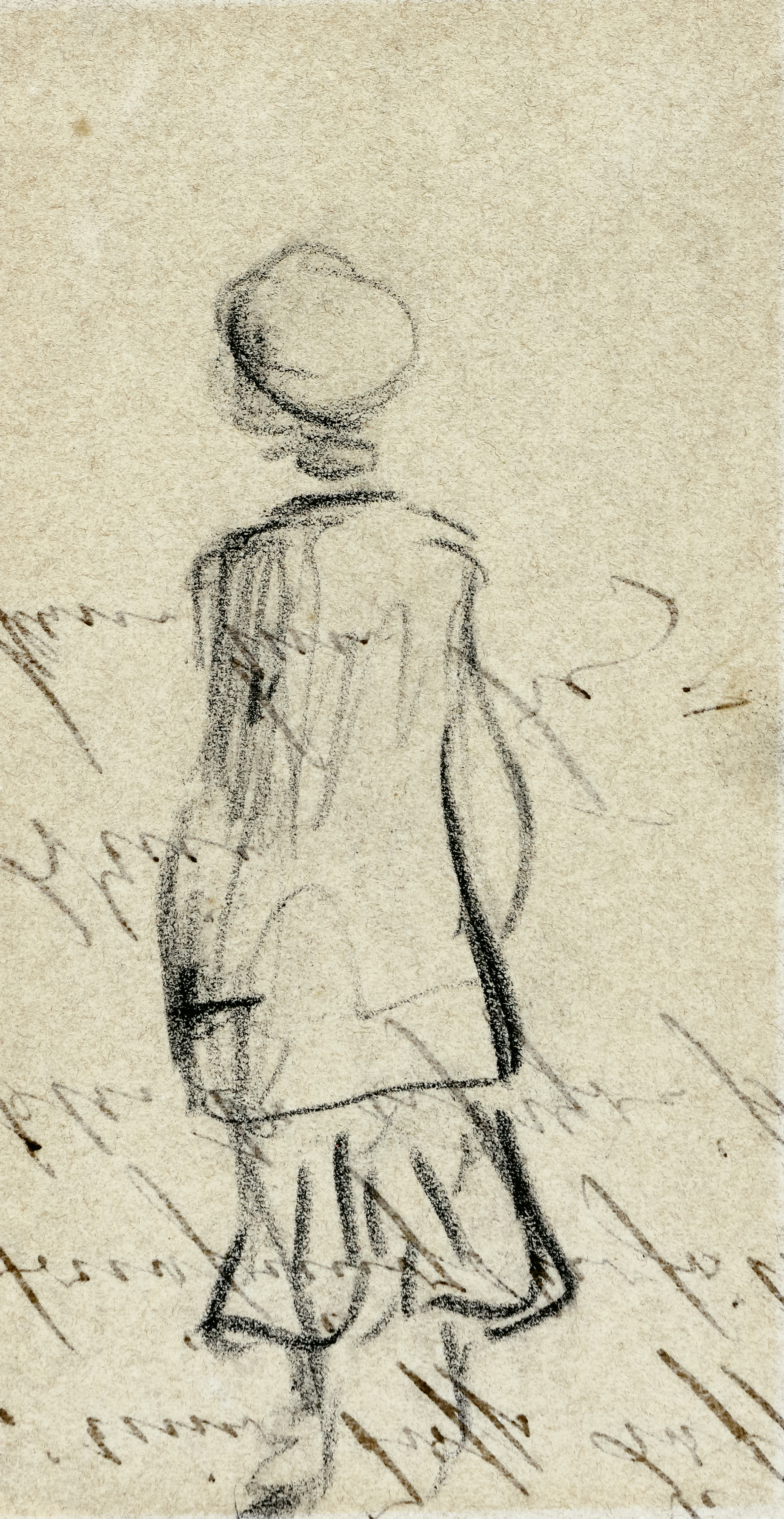 Frau von hinten. Bleistiftzeichnung auf Velin, rückseitig beschrieben. 12 x 5 cm, Bg. 14,3 x 7,8 cm. Rückseitig auf dem Unterlagekarton mit dem roten Nachlassstempel (Rosenbach 4) und dem Monogramm von Sophie Zille.  (1060-26)