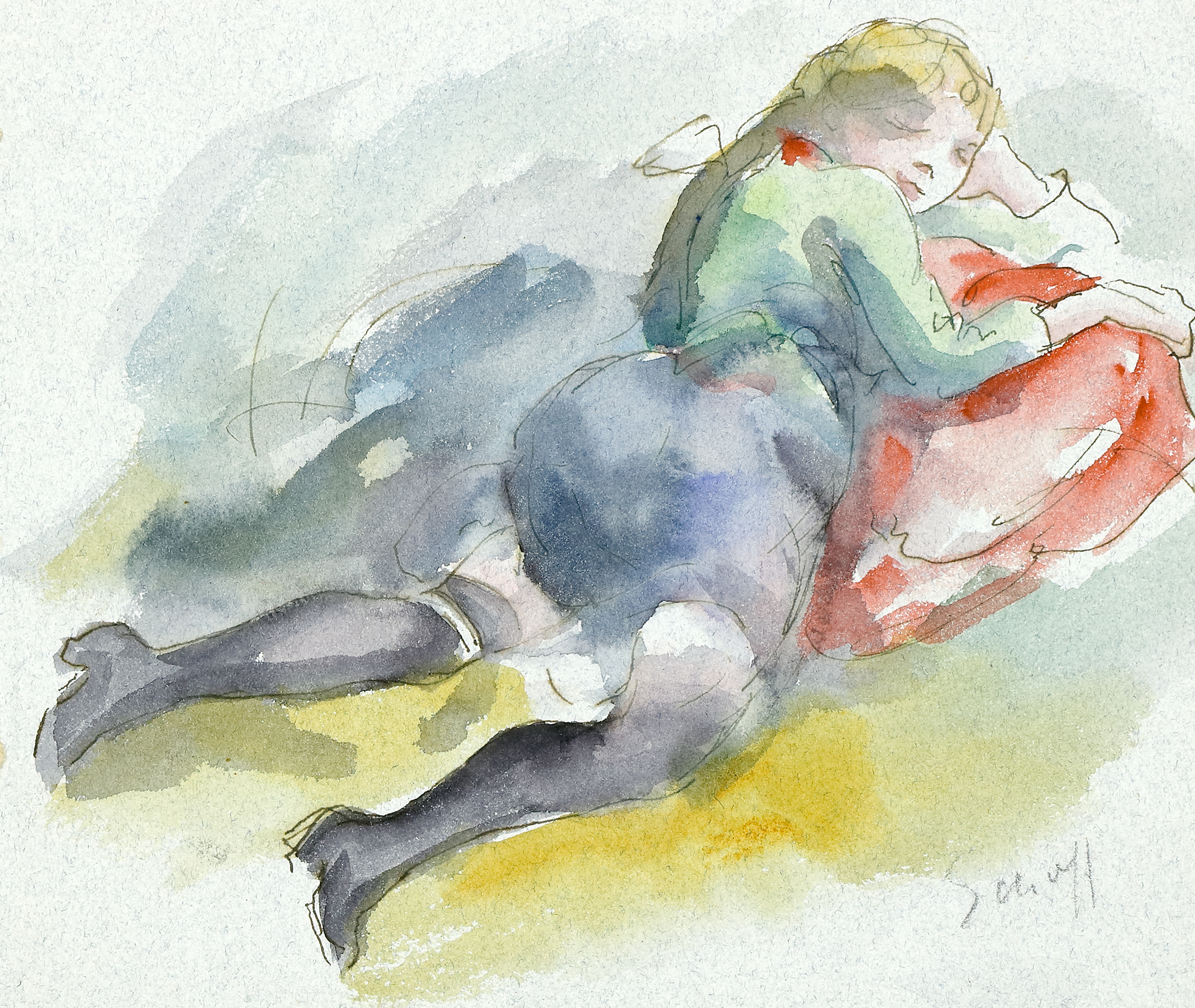 Liegendes Mädchen. Aquarell und Tuschpinsel auf hellgrauem Bütten. 17 x 19,5 cm. Signiert. Hinter Passepartout montiert. (1060-4)