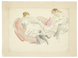 Szene mit drei Frauen. Aquarellierte Bleistiftzeichnung auf Velin. 23 x 31,8 cm. Rechts unten signiert. Rückseitig roter Stempel (unleserlich). An den oberen Ecken auf der Unterlage montiert, rückseitig mit dem runden Stempel Sammlung Rössner-Höch (Schwester der Künstlerin). (1060-5)
