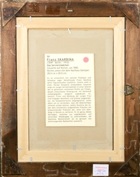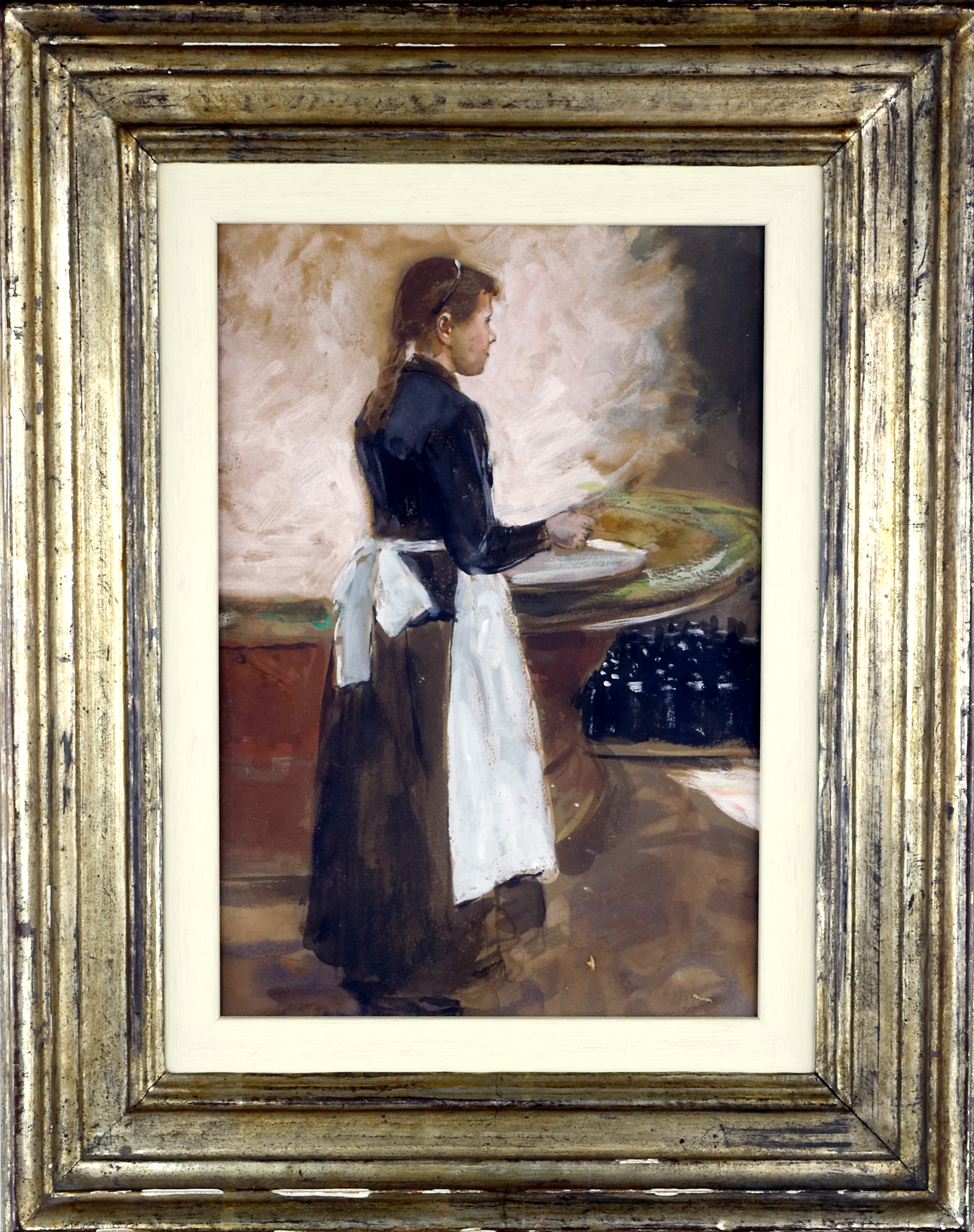 Das Serviermädchen. Um 1890. Die Dargestellte befindet sich wohl am Karlsbader Strudel, was durch die sich rechts befindenden Flaschen angedeutet wird. Gouache auf Karton auf Pappe. Ca. 28 x 20 cm. Rechts unten mit dem Nachlassstempel, schwach leserlich. Unter Glas gerahmt. (1066-11)