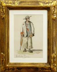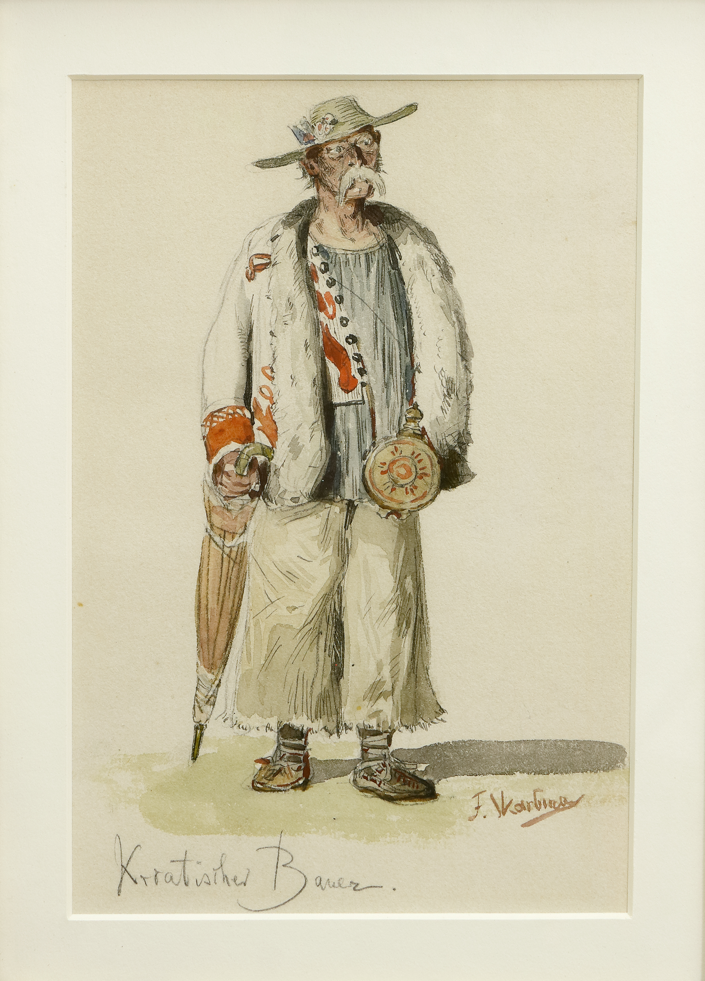 Kroatischer Bauer, in typischer Tracht mit Schirm. Aquarell über Bleistift auf Papier. 22 x 14 cm. Rechts unten signiert und links unten bezeichnet. Im Passepartout, unter Glas gerahmt.  (1066-13)